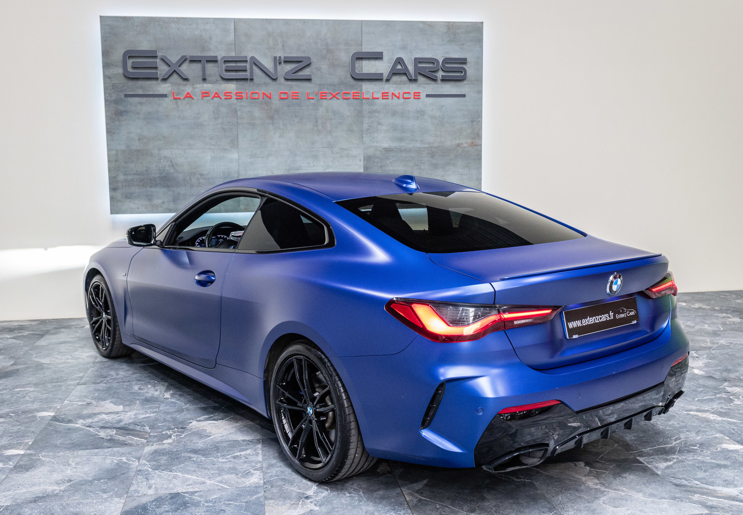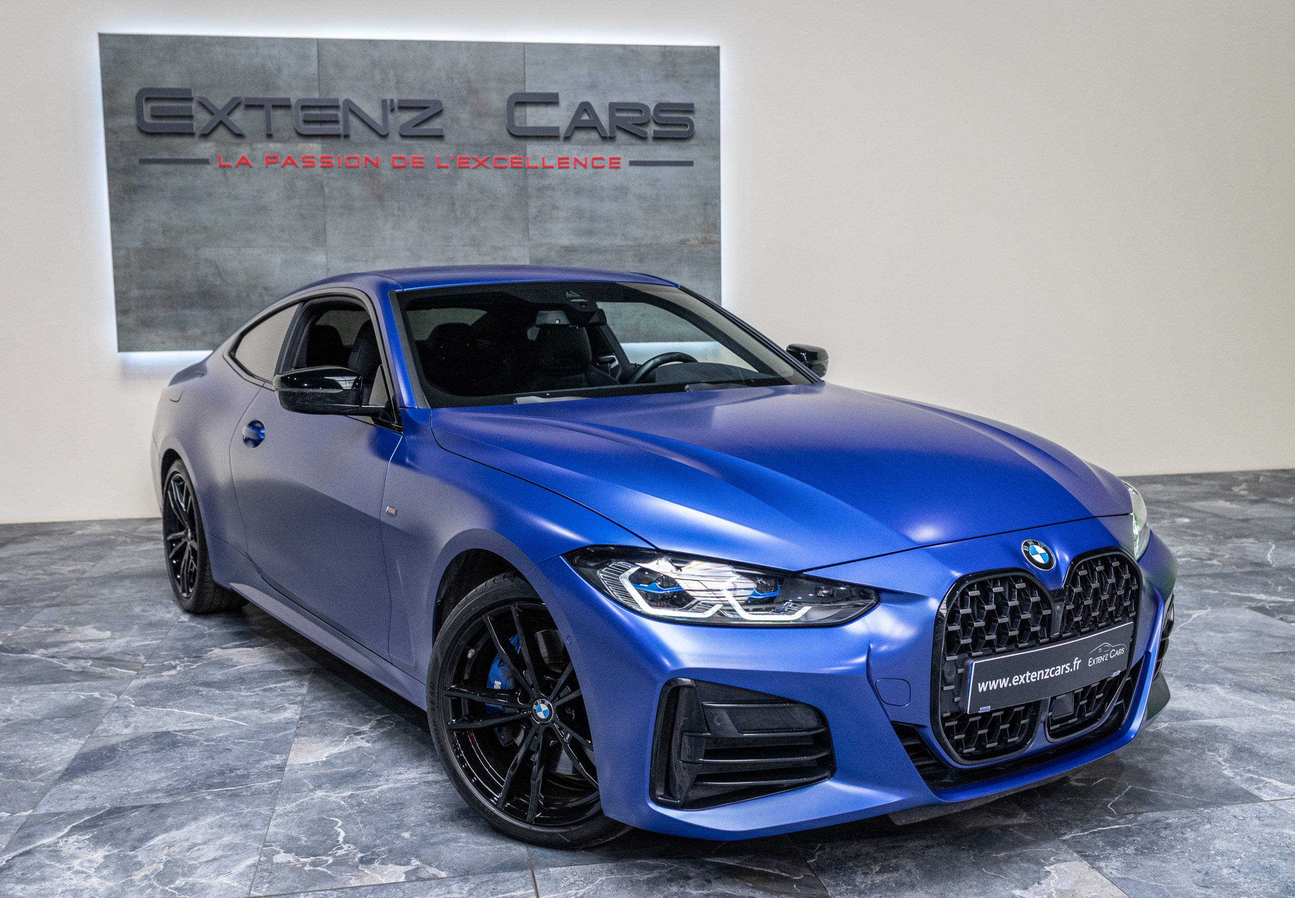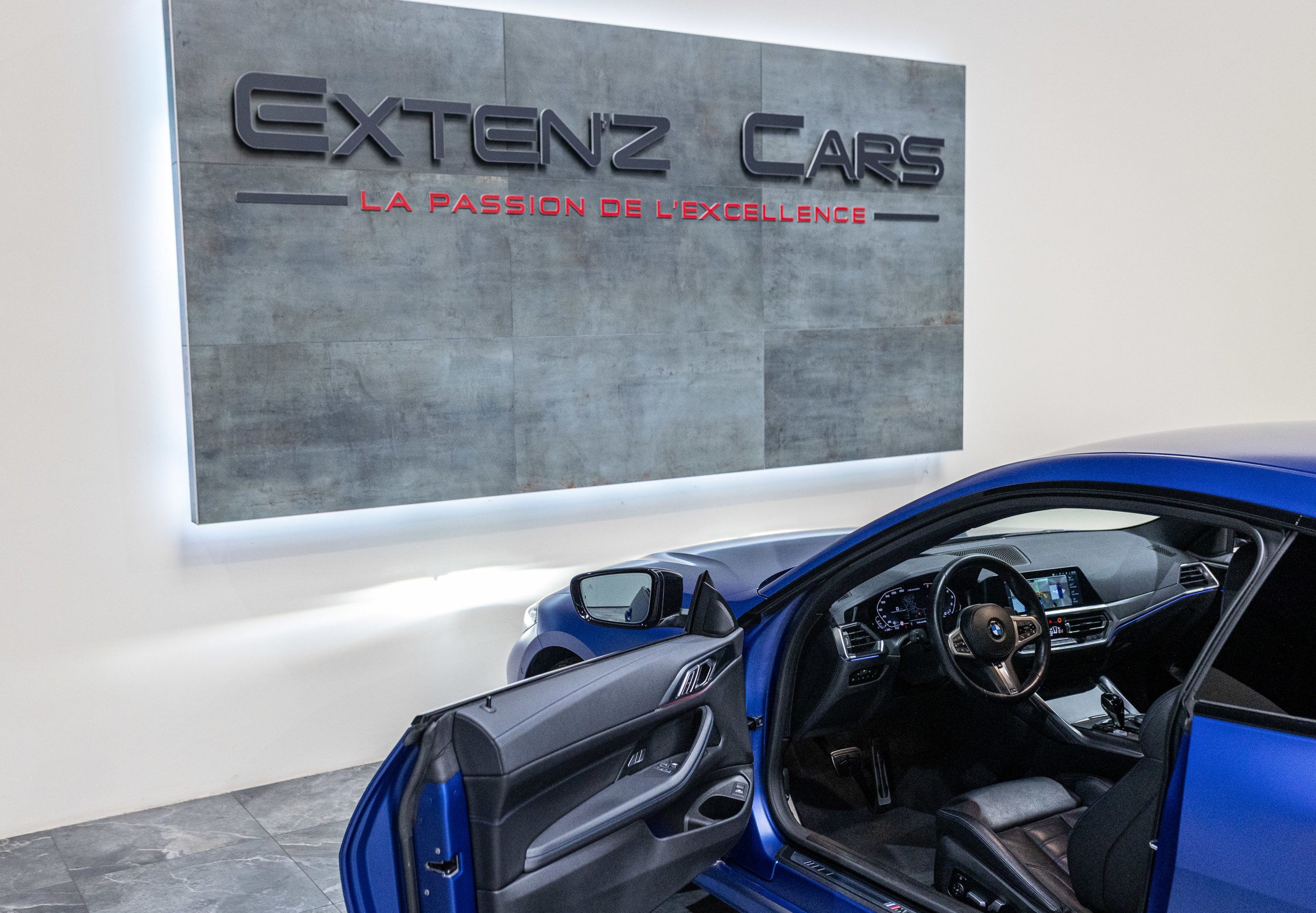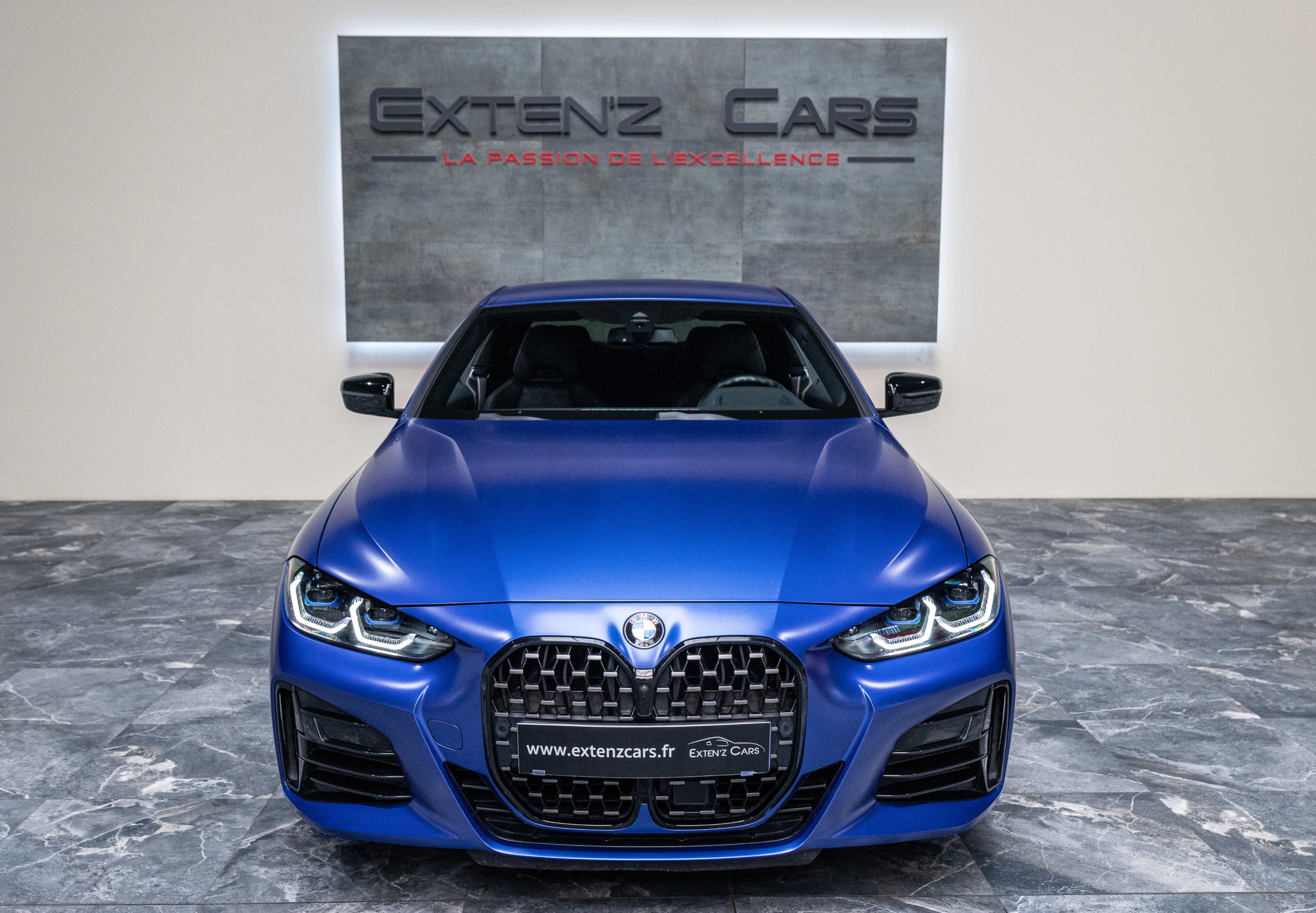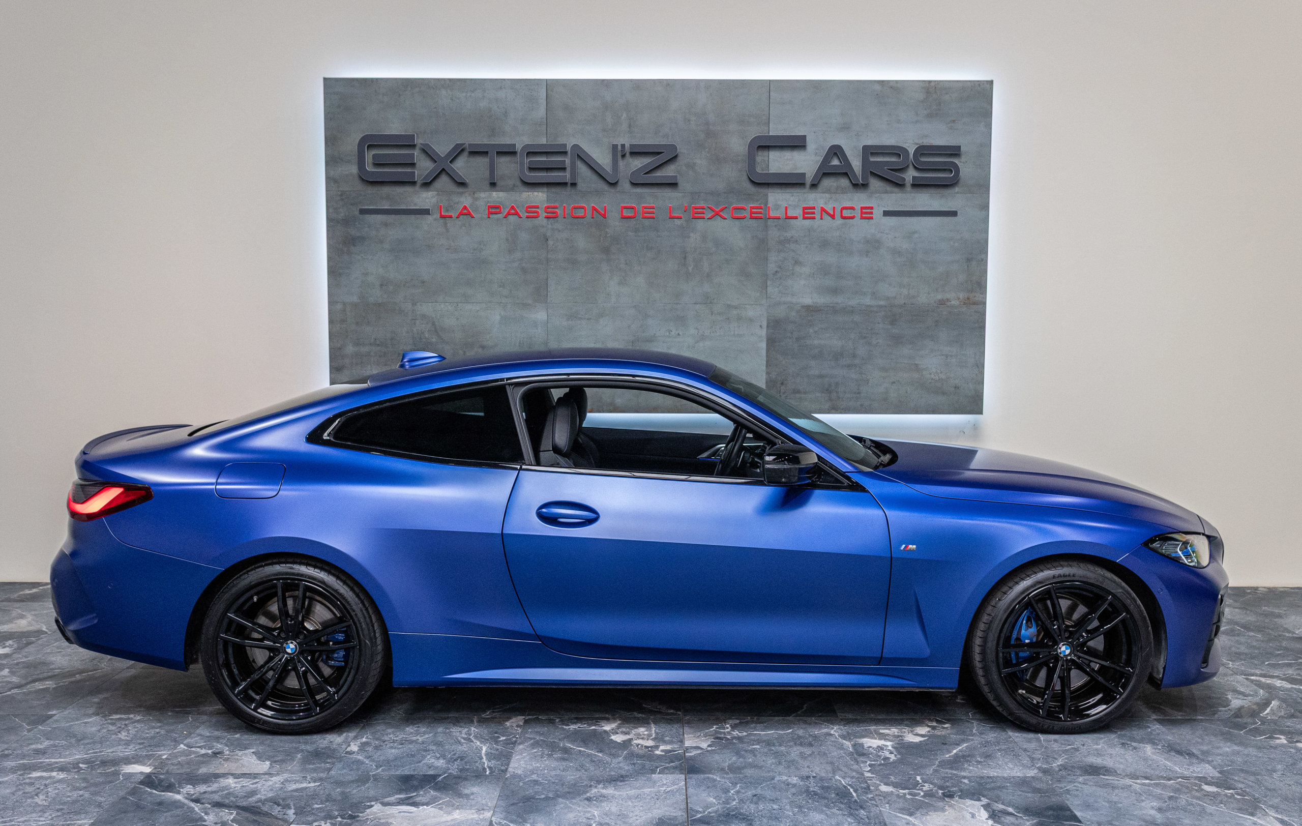 EXTEN’Z CARS vous présente cette BMW Série 4 Coupé M 440i xDrive, développant 374 CV (26cv) dans une configuration absolument parfaite. La teinte Frozen Portimao Blue, exclusive et satinée, lui donne une présence visuelle incroyable. C’est une couleur qui change selon la lumière, qui capte l’œil sans jamais tomber dans l’excès. La ligne du coupé G22 est racée, équilibrée, musclée juste ce qu’il faut. Avec les jantes noires, les étriers bleus M, les sorties d’échappement noires brillantes et les finitions Shadow Line, tout est cohérent, tout respire la sportivité classe. Sous le capot, le six cylindres en ligne BMW dans sa meilleure forme. 374 chevaux, un couple disponible à tous les régimes, une sonorité parfaitement dosée, et une boîte ZF à 8 rapports qui fait toujours ce qu’il faut, au bon moment. La transmission xDrive assure une motricité impeccable sans jamais brider le plaisir.