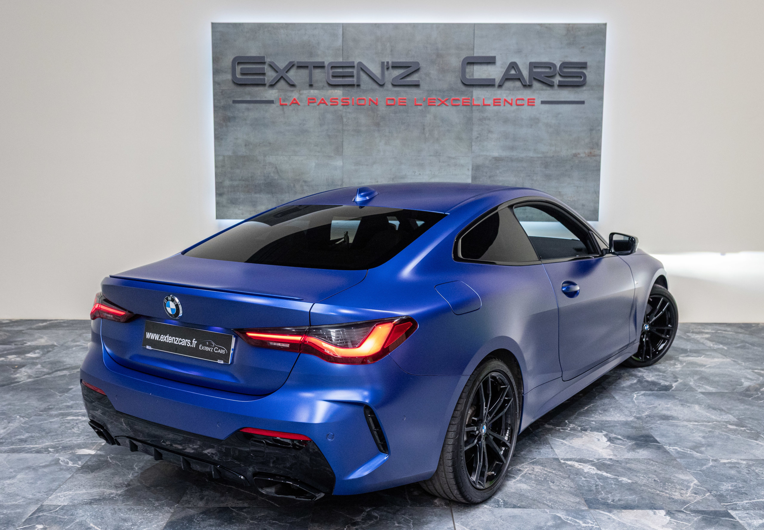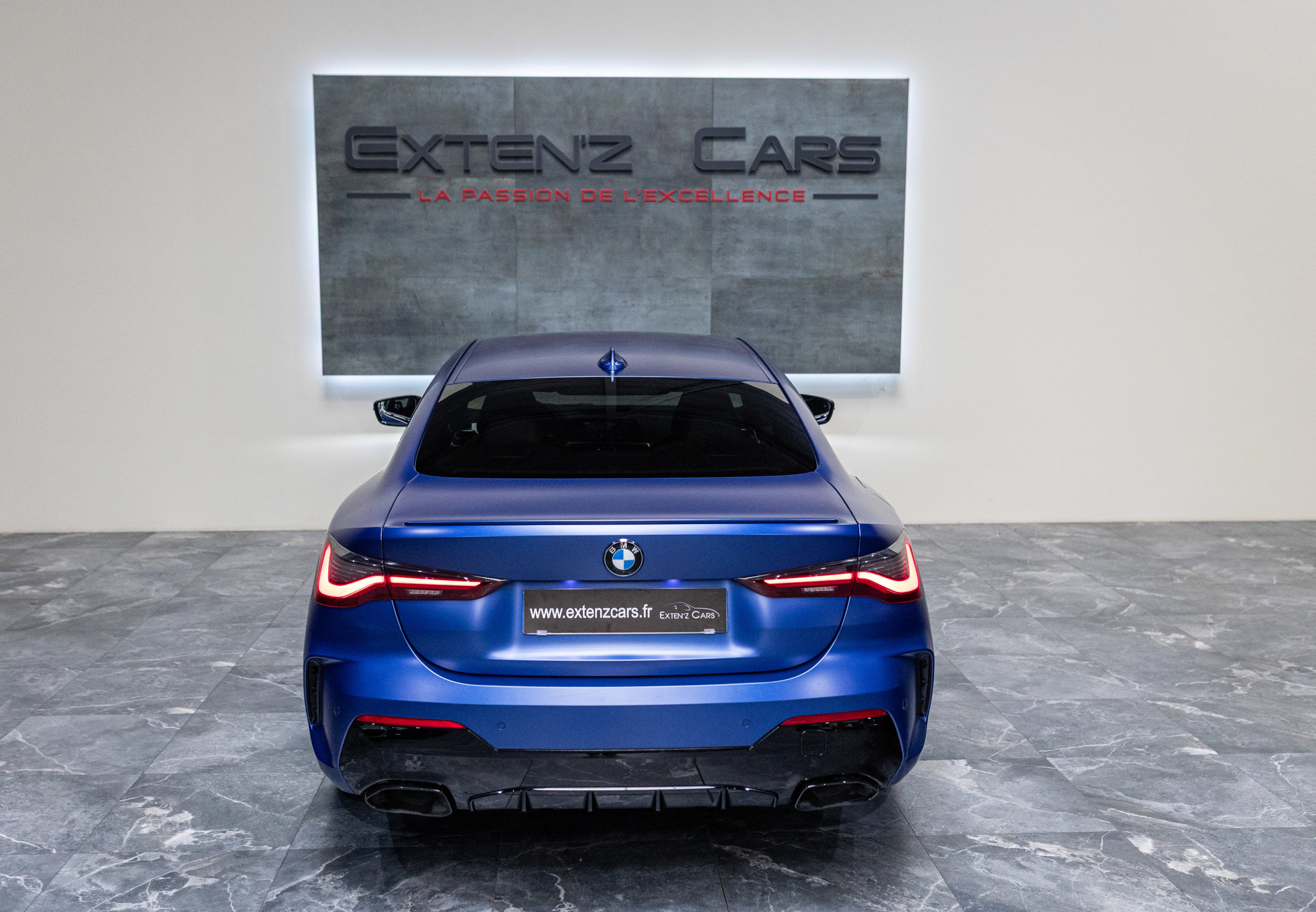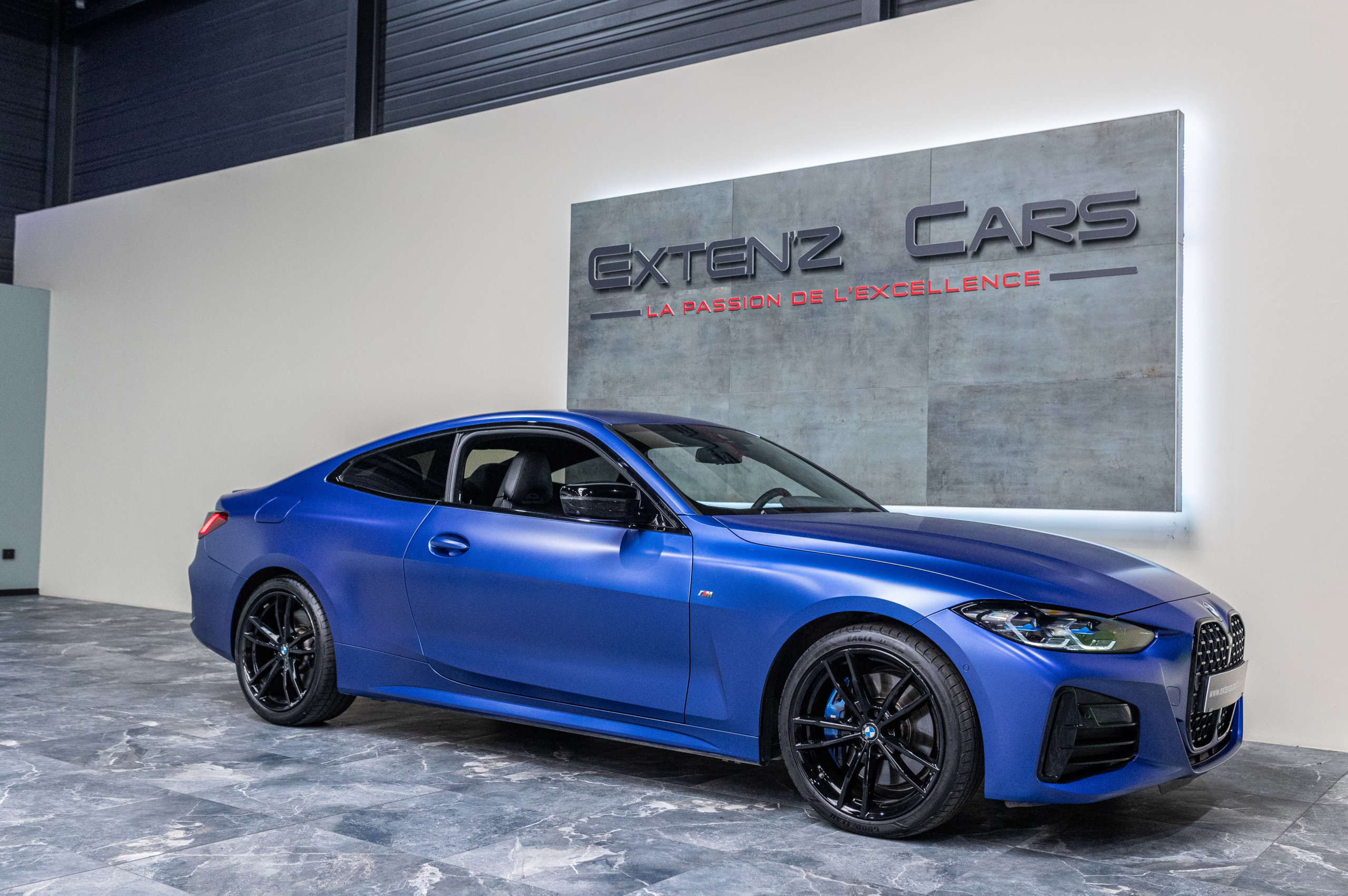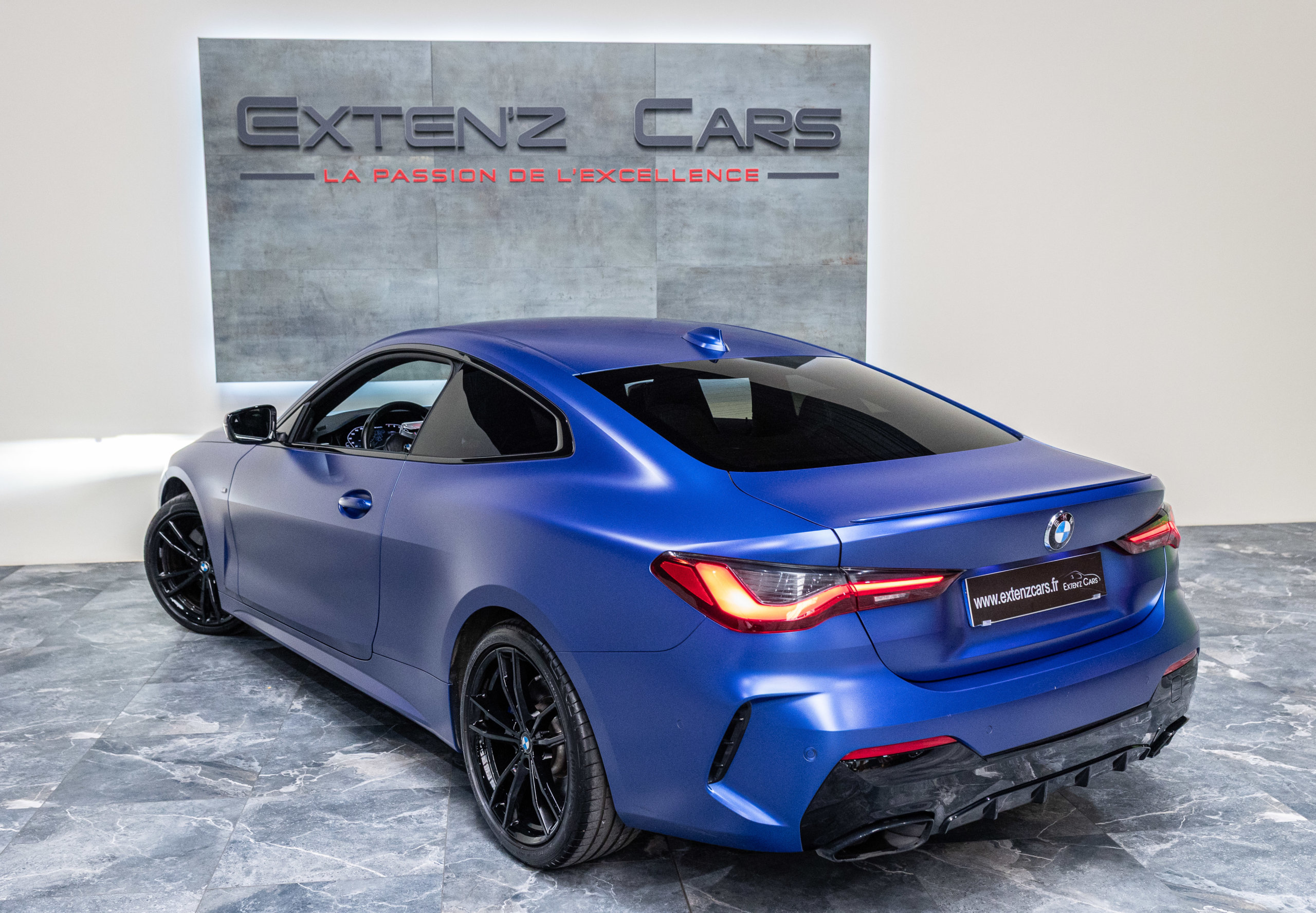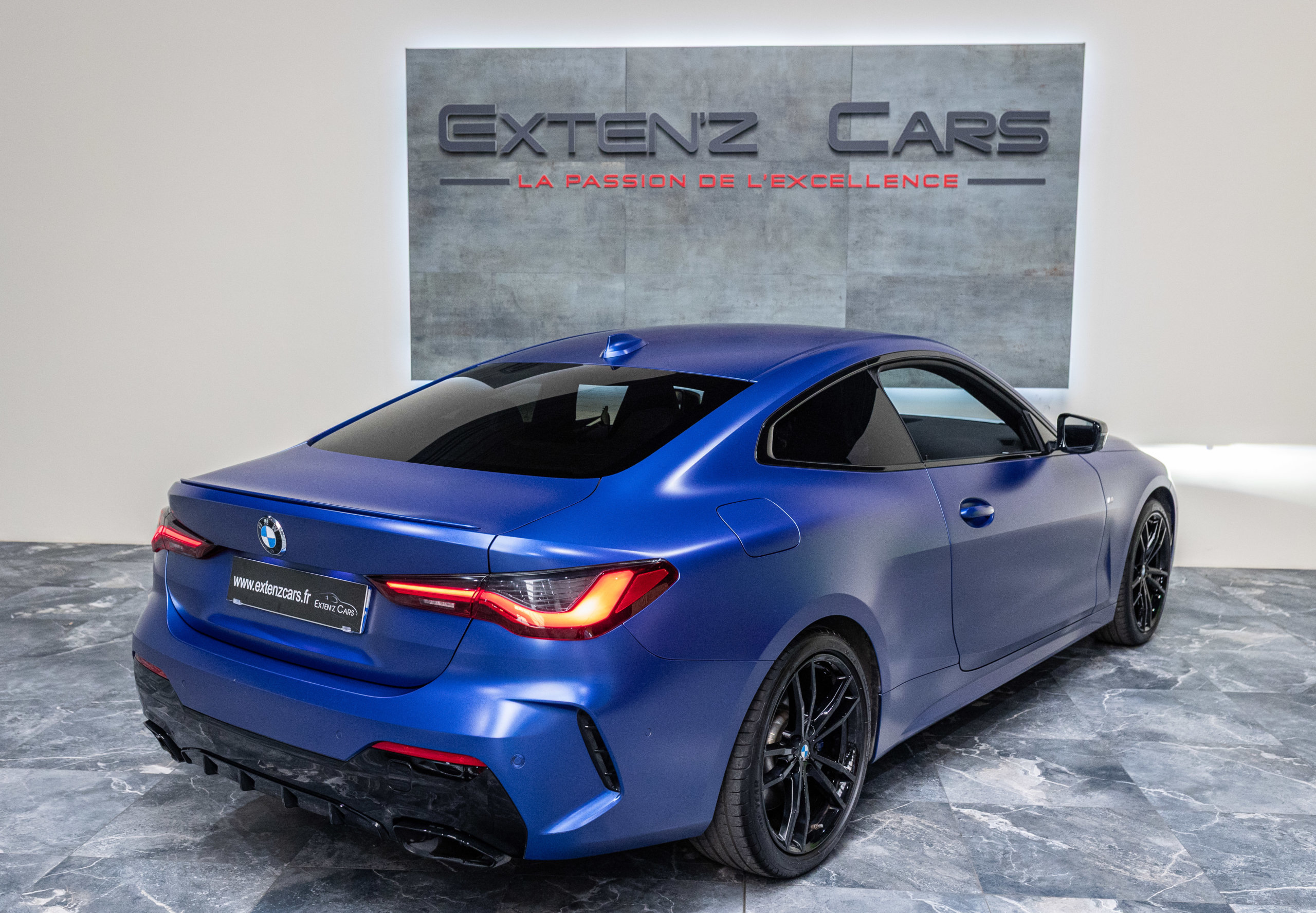 EXTEN’Z CARS vous présente cette BMW Série 4 Coupé M 440i xDrive, développant 374 CV (26cv) dans une configuration absolument parfaite. La teinte Frozen Portimao Blue, exclusive et satinée, lui donne une présence visuelle incroyable. C’est une couleur qui change selon la lumière, qui capte l’œil sans jamais tomber dans l’excès. La ligne du coupé G22 est racée, équilibrée, musclée juste ce qu’il faut. Avec les jantes noires, les étriers bleus M, les sorties d’échappement noires brillantes et les finitions Shadow Line, tout est cohérent, tout respire la sportivité classe. Sous le capot, le six cylindres en ligne BMW dans sa meilleure forme. 374 chevaux, un couple disponible à tous les régimes, une sonorité parfaitement dosée, et une boîte ZF à 8 rapports qui fait toujours ce qu’il faut, au bon moment. La transmission xDrive assure une motricité impeccable sans jamais brider le plaisir.