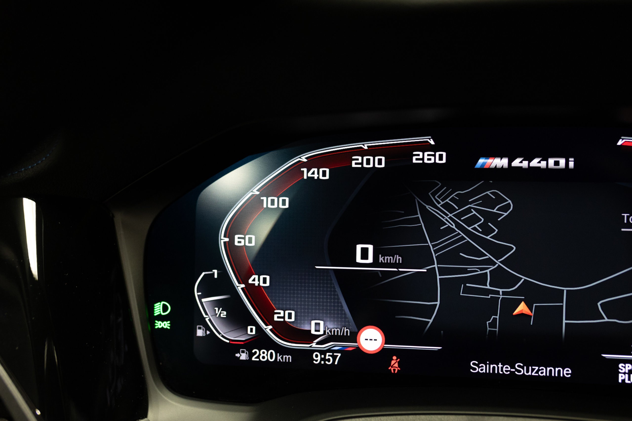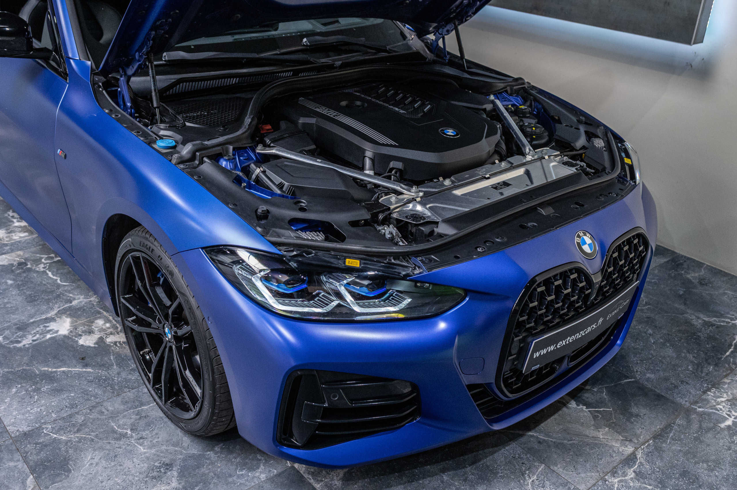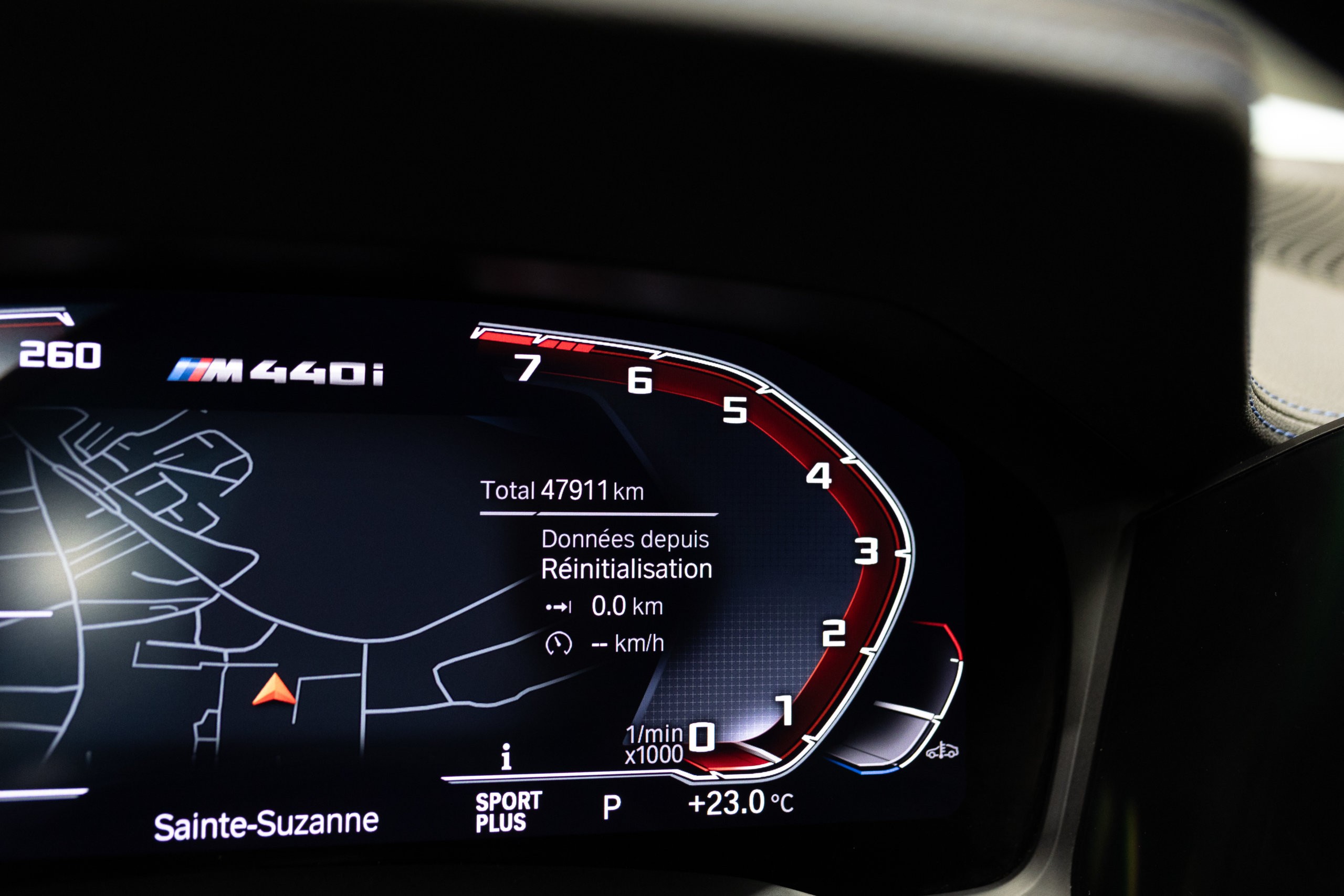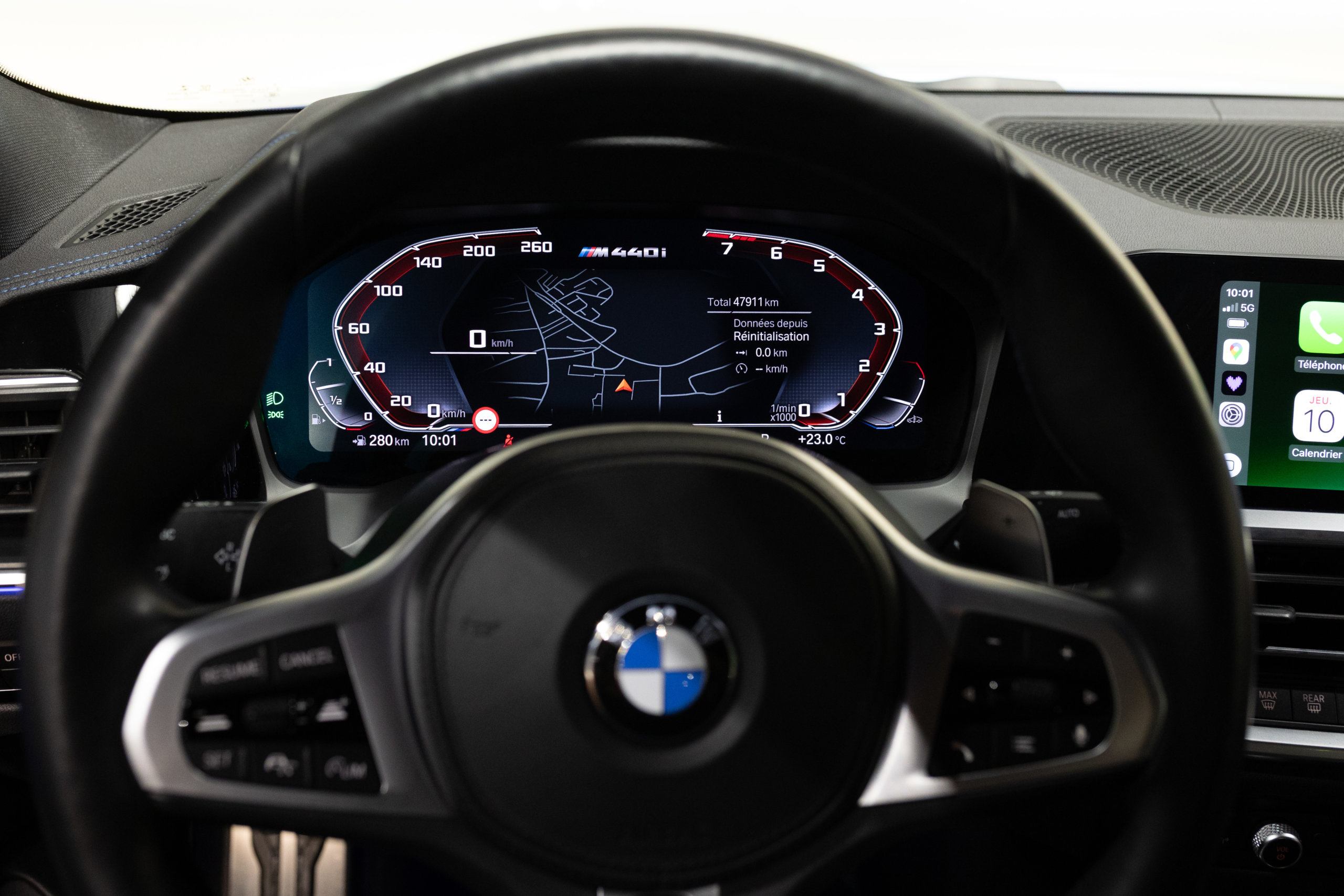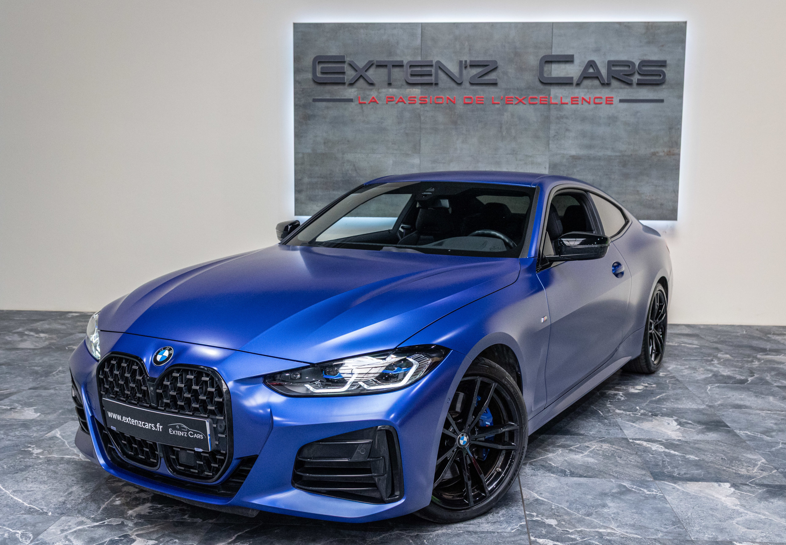 EXTEN’Z CARS vous présente cette BMW Série 4 Coupé M 440i xDrive, développant 374 CV (26cv) dans une configuration absolument parfaite. La teinte Frozen Portimao Blue, exclusive et satinée, lui donne une présence visuelle incroyable. C’est une couleur qui change selon la lumière, qui capte l’œil sans jamais tomber dans l’excès. La ligne du coupé G22 est racée, équilibrée, musclée juste ce qu’il faut. Avec les jantes noires, les étriers bleus M, les sorties d’échappement noires brillantes et les finitions Shadow Line, tout est cohérent, tout respire la sportivité classe. Sous le capot, le six cylindres en ligne BMW dans sa meilleure forme. 374 chevaux, un couple disponible à tous les régimes, une sonorité parfaitement dosée, et une boîte ZF à 8 rapports qui fait toujours ce qu’il faut, au bon moment. La transmission xDrive assure une motricité impeccable sans jamais brider le plaisir.
