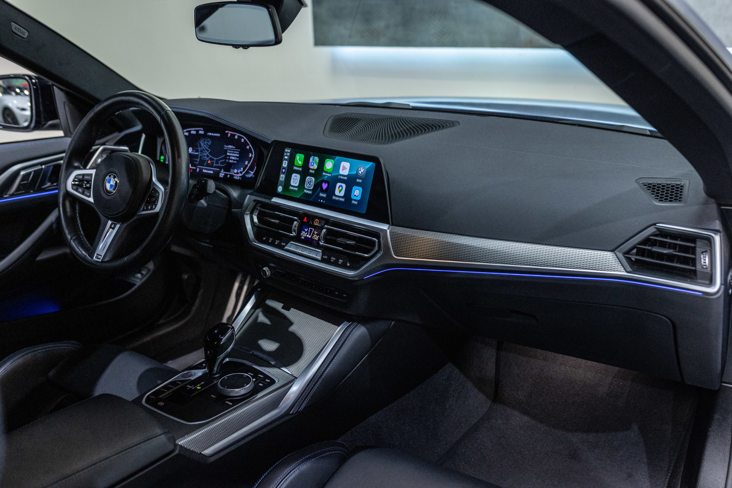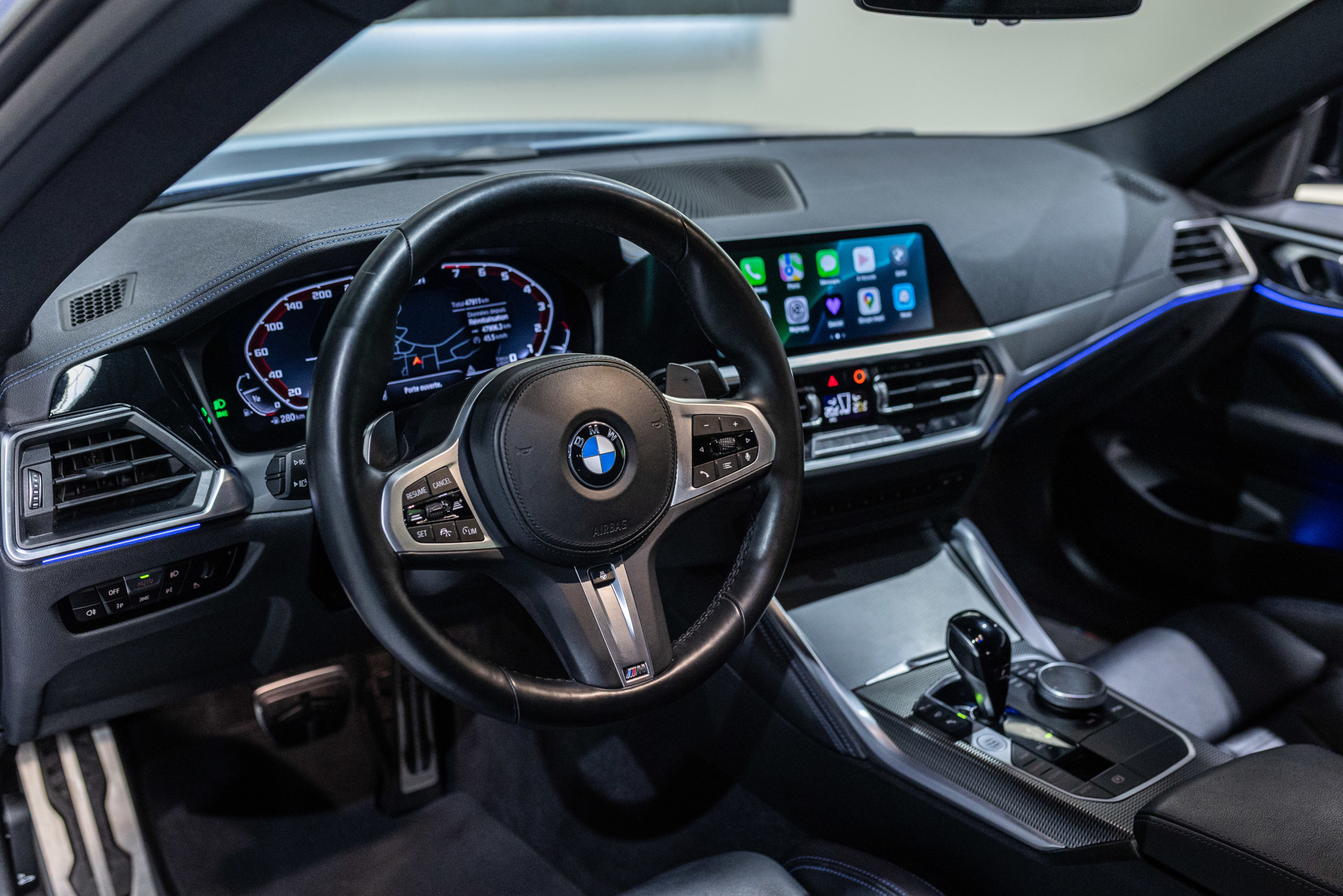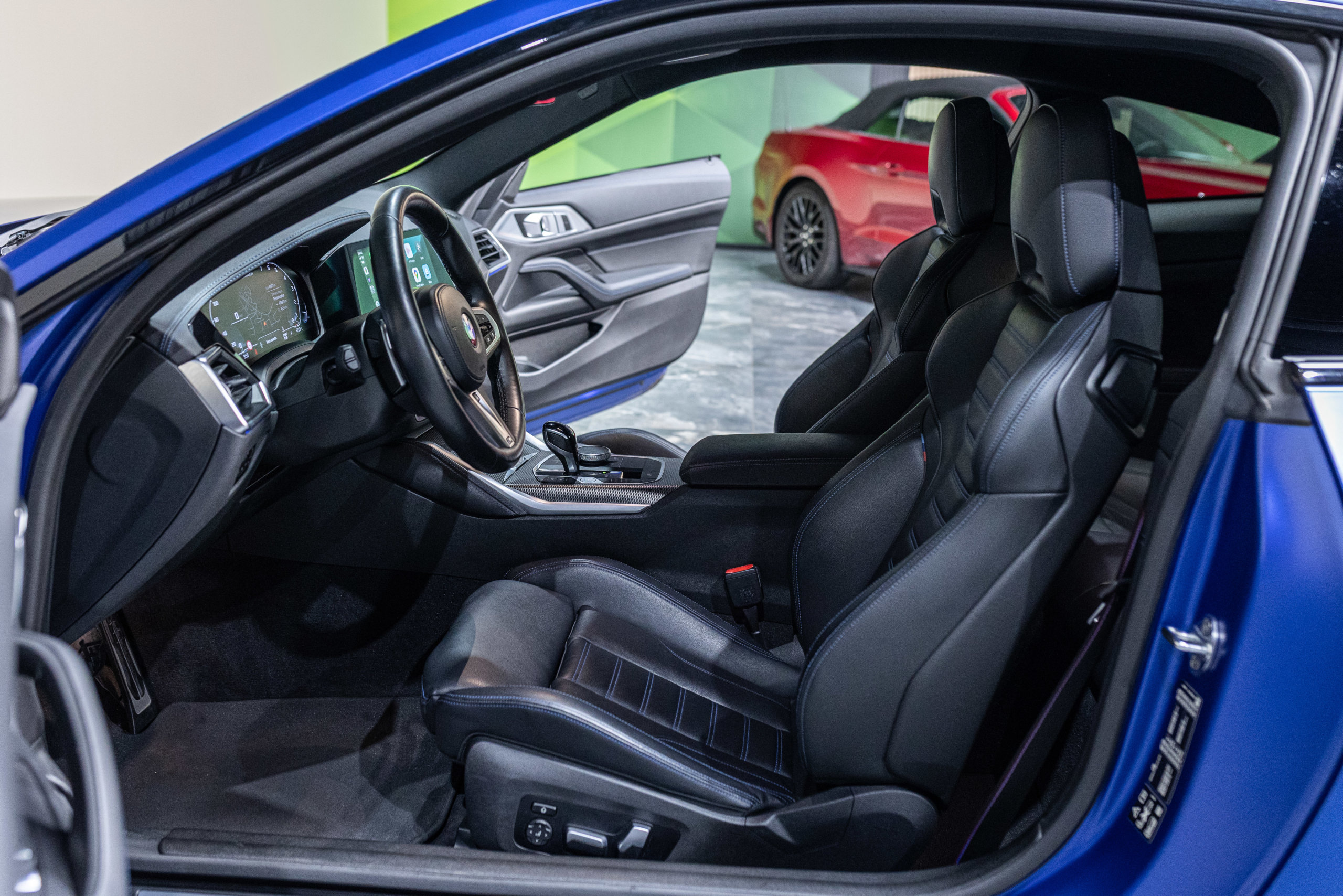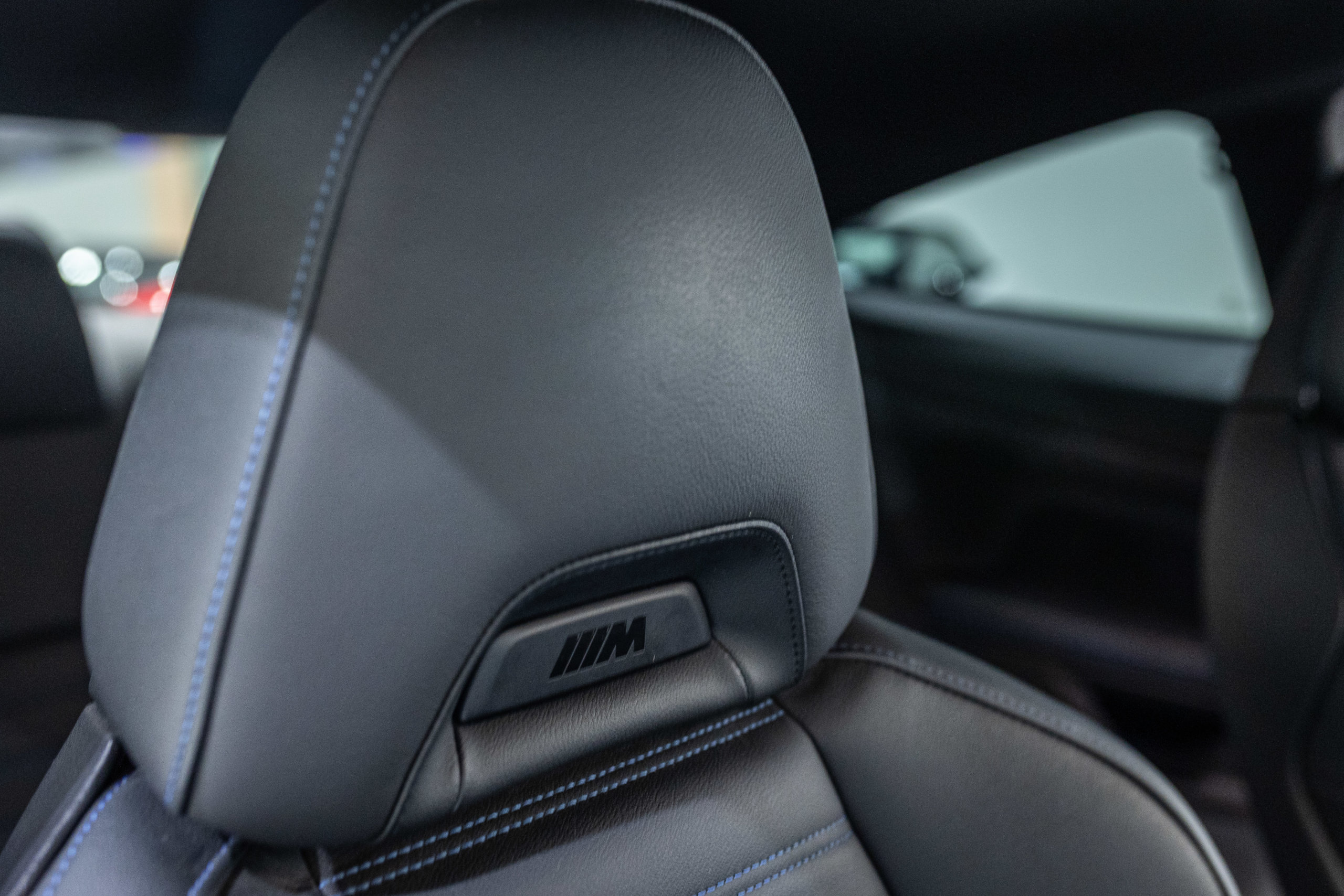 À l’intérieur, on retrouve un habitacle sport et raffiné, avec les sièges M en cuir noir, le combiné digital, l’interface BMW iDrive dernière génération, et tous les petits détails qu’on attend d’un vrai coupé haut de gamme.