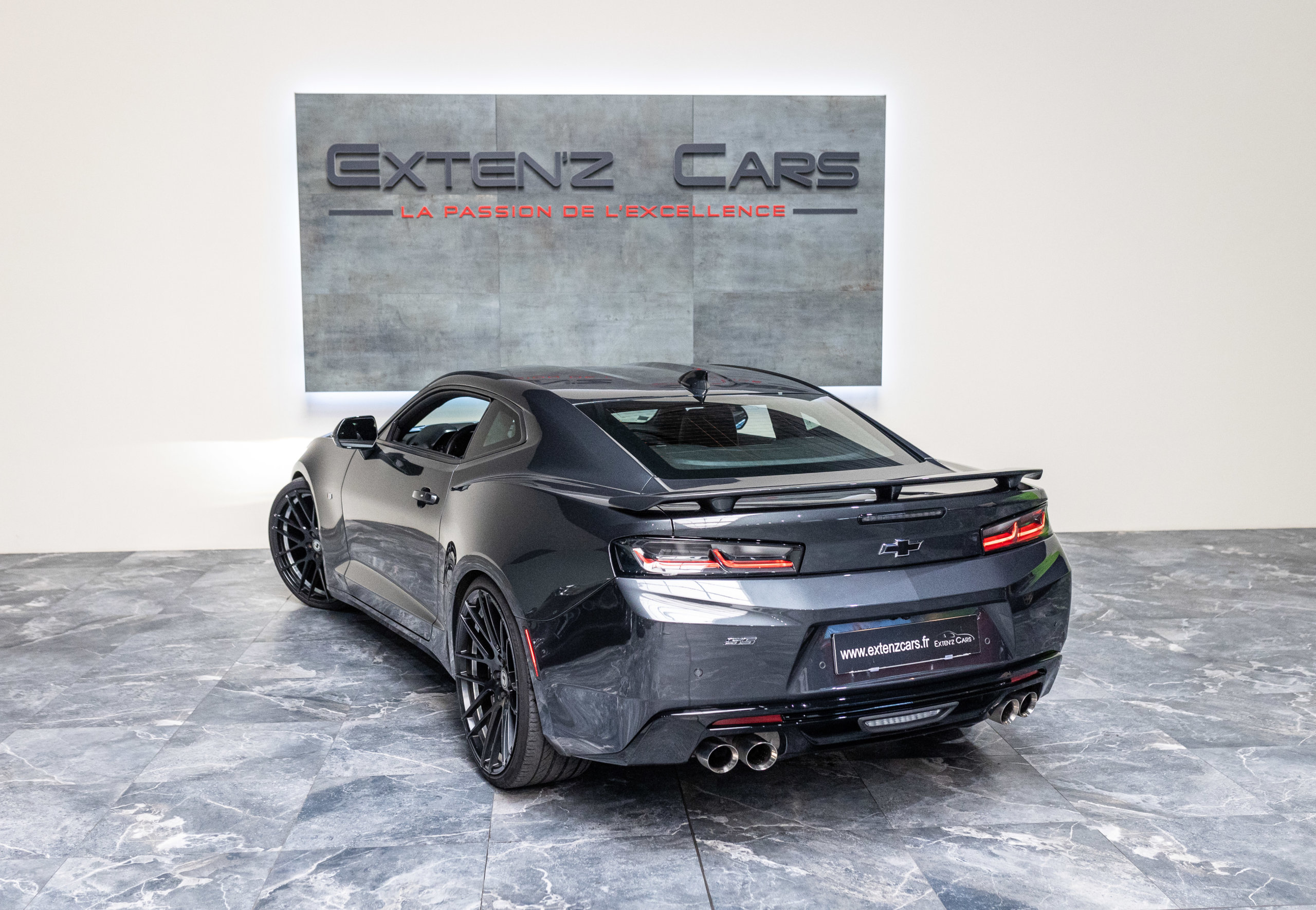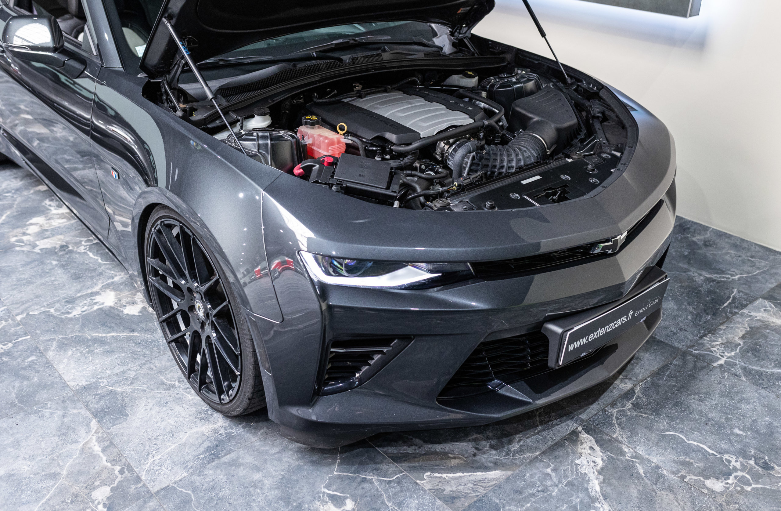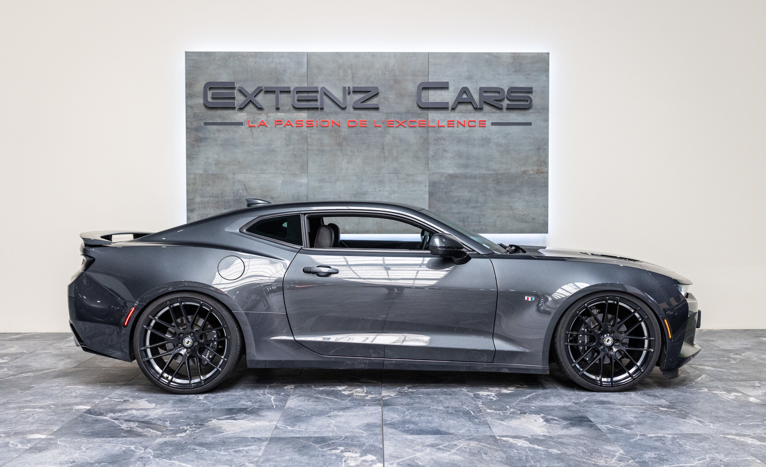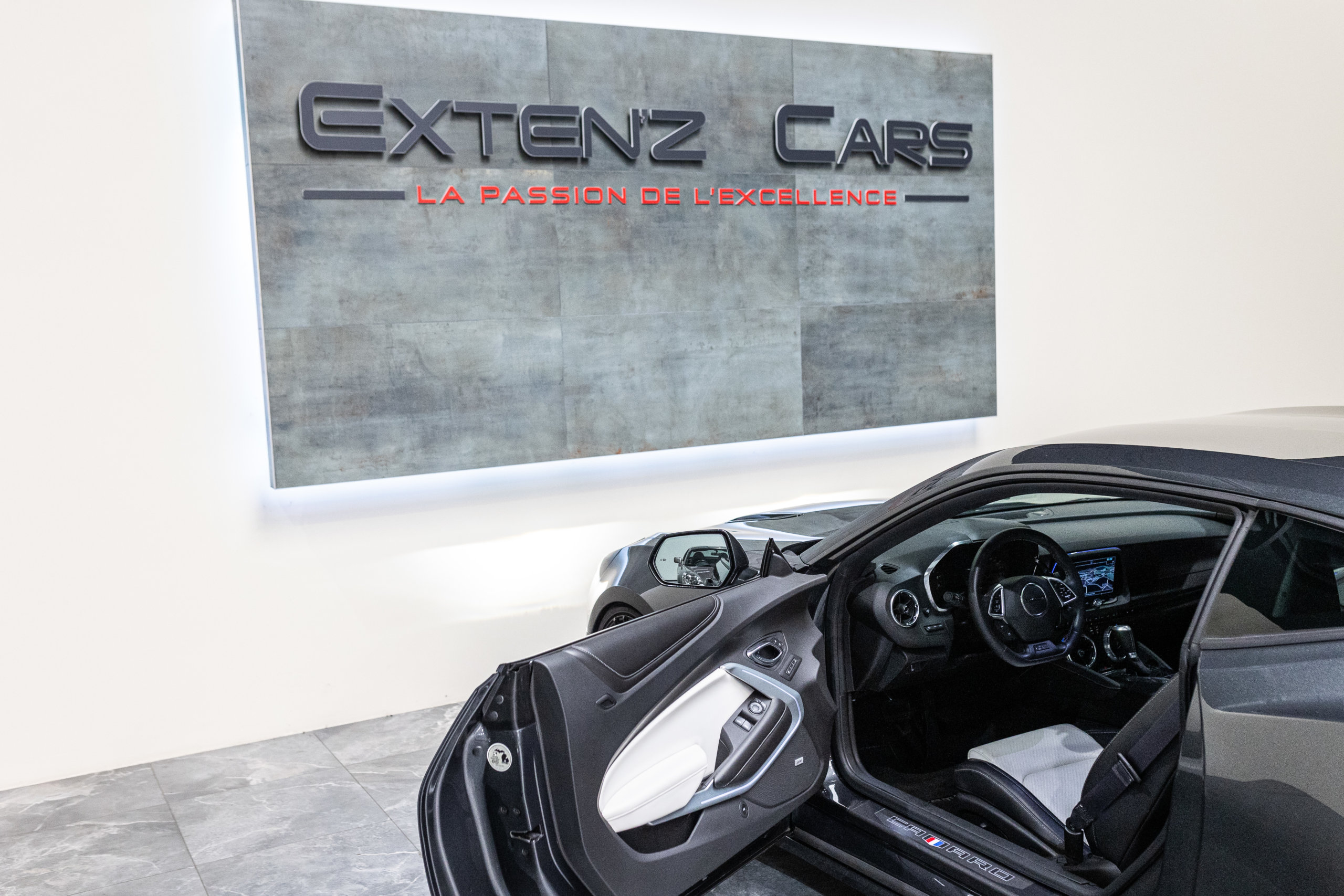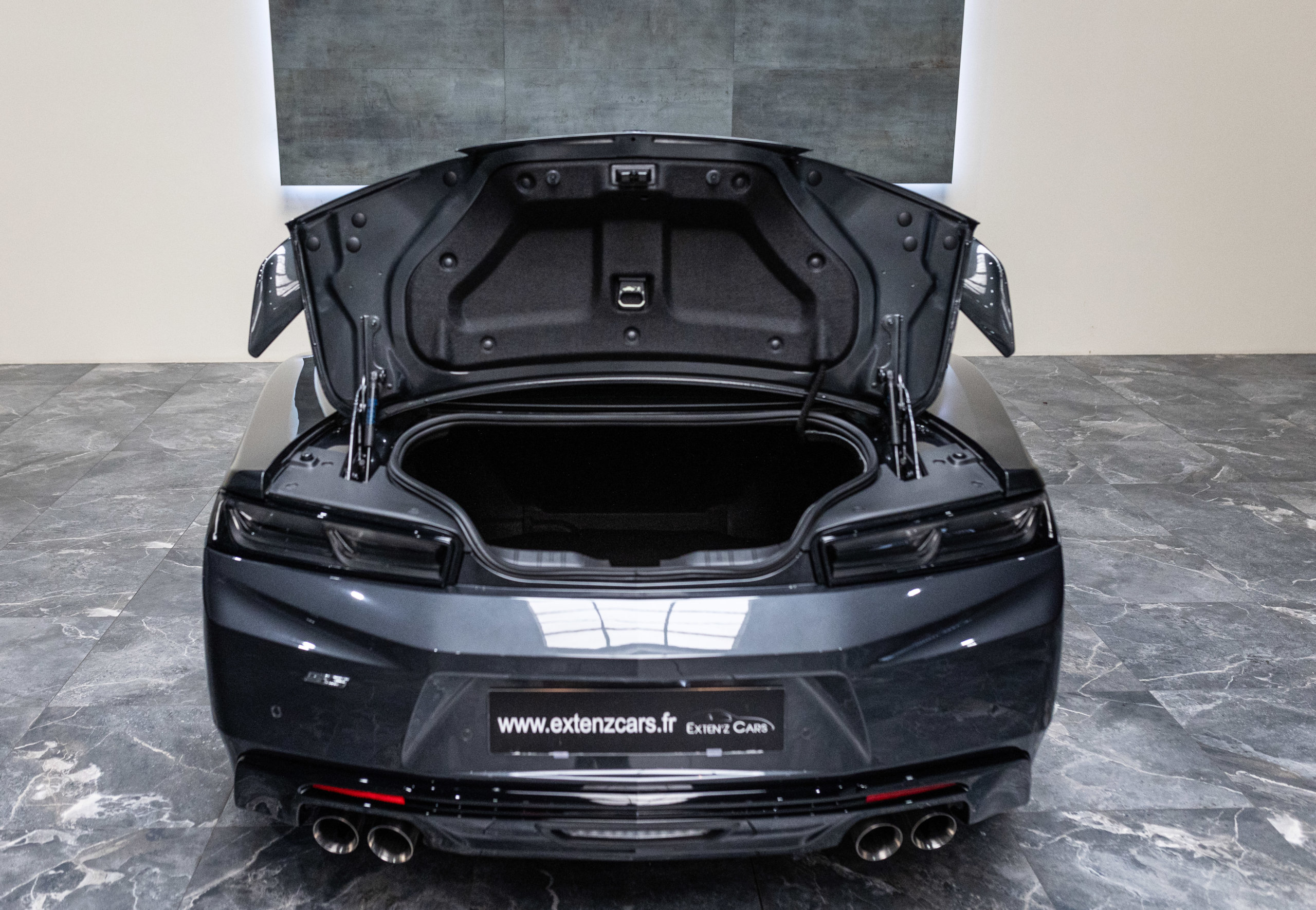 EXTEN’Z CARS vous propose cette séduisante Chevrolet Camaro VI Coupé avec son fantastique V8 6.2 Atmosphérique développant 453 CV (35cv), mise en circulation le 21/12/2016 de couleur NightFall Grey Métallic. Associée à une boite à vitesse automatique à 8 rapports, si vous préférez une conduite plus sportive, il lui suffit de passer en mode manuel à l’aide des palettes de changement de vitesse au volant pour disposer alors des 8 rapports fixes. Cette Camaro distille beaucoup de plaisir à ses occupants tout en offrant un rapport prix/plaisir. En particulier sa silhouette bodybuildée, la position de conduite est parfaite et on peut admirer devant soi le long capot bosselé. Prendre les commandes d’un tel engin, aussi imposant par le gabarit que par son histoire, génère des sensations extraordinaires.