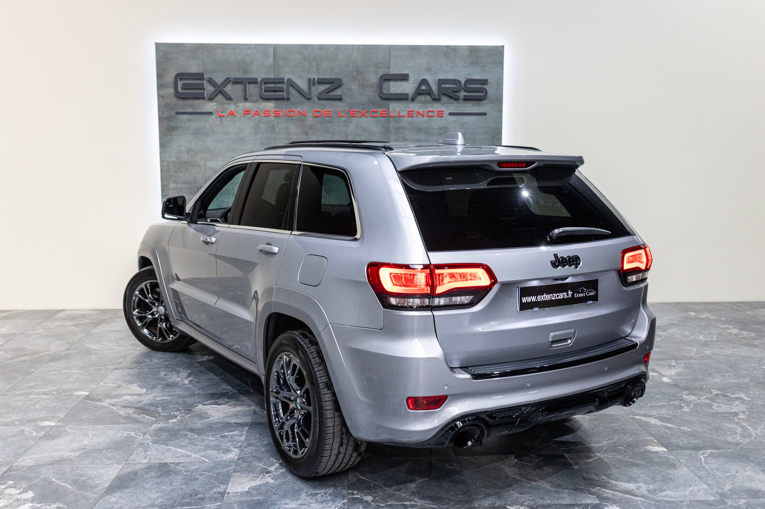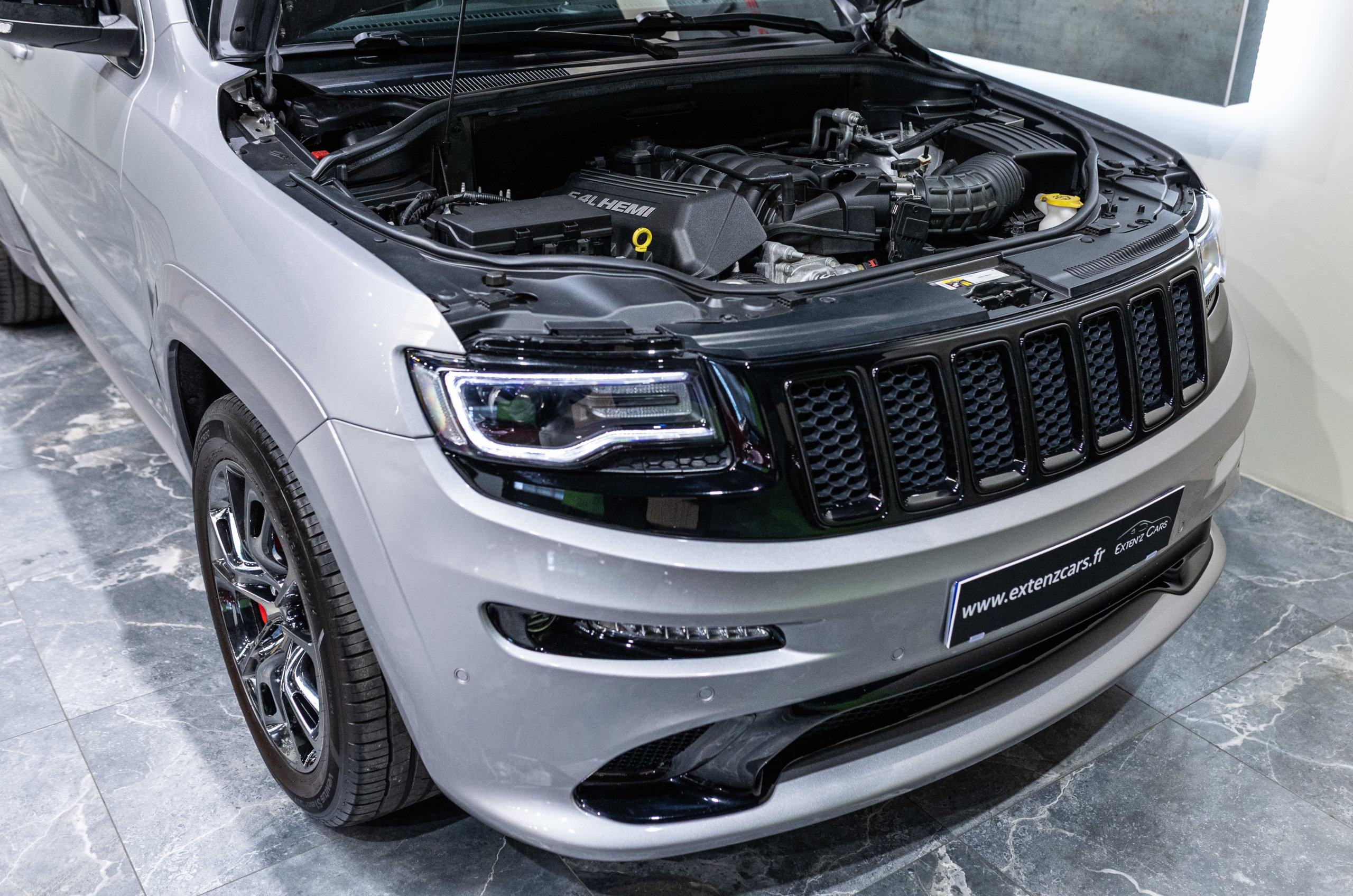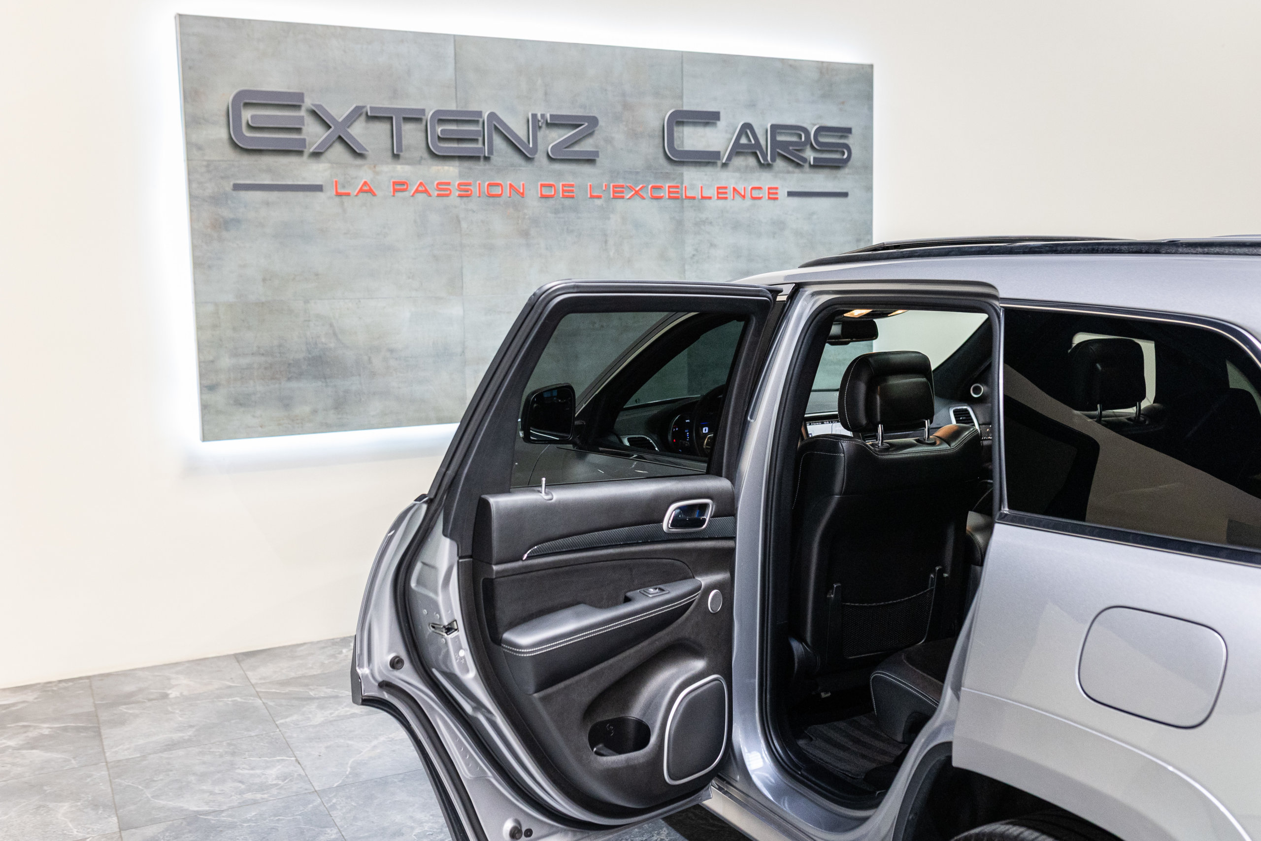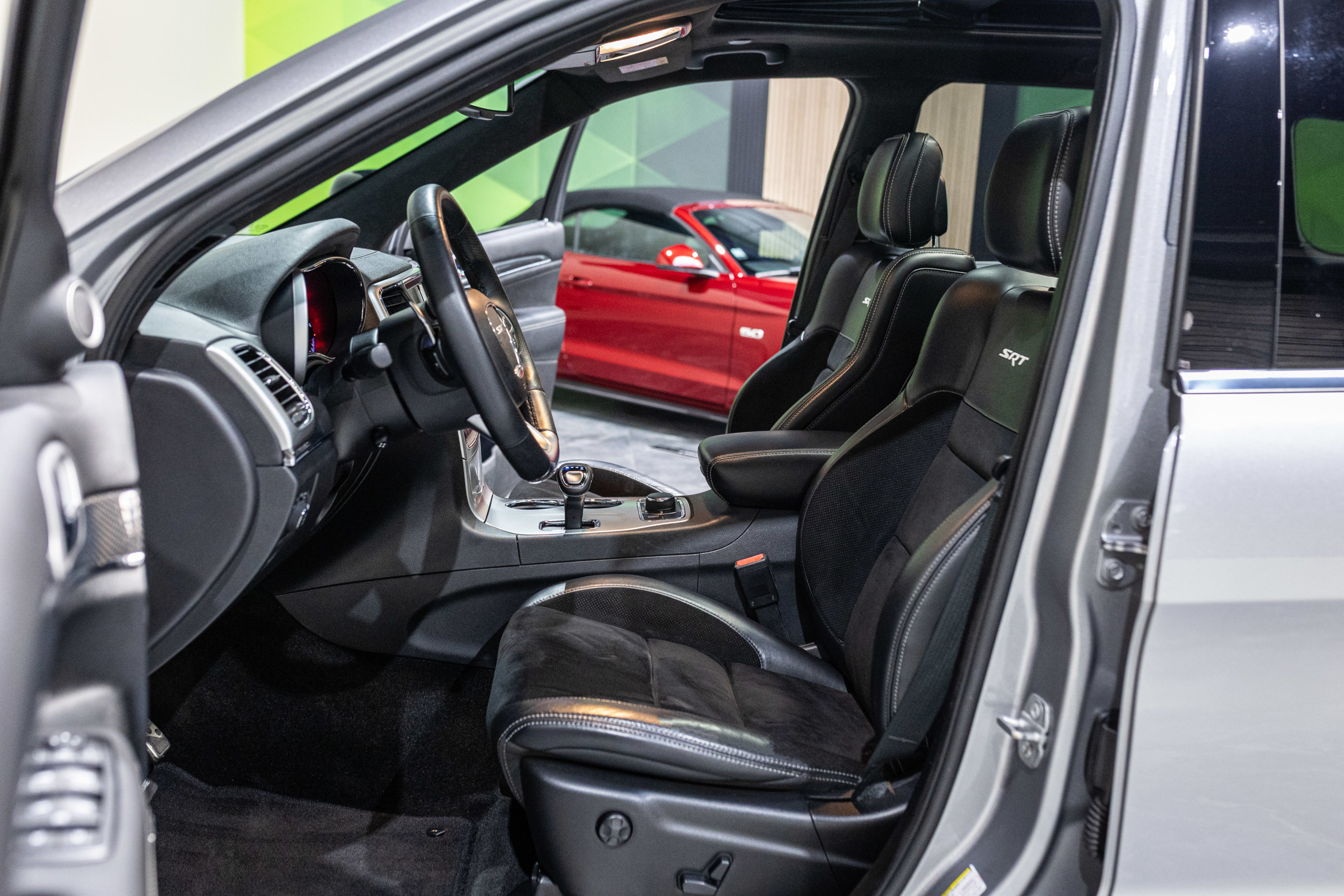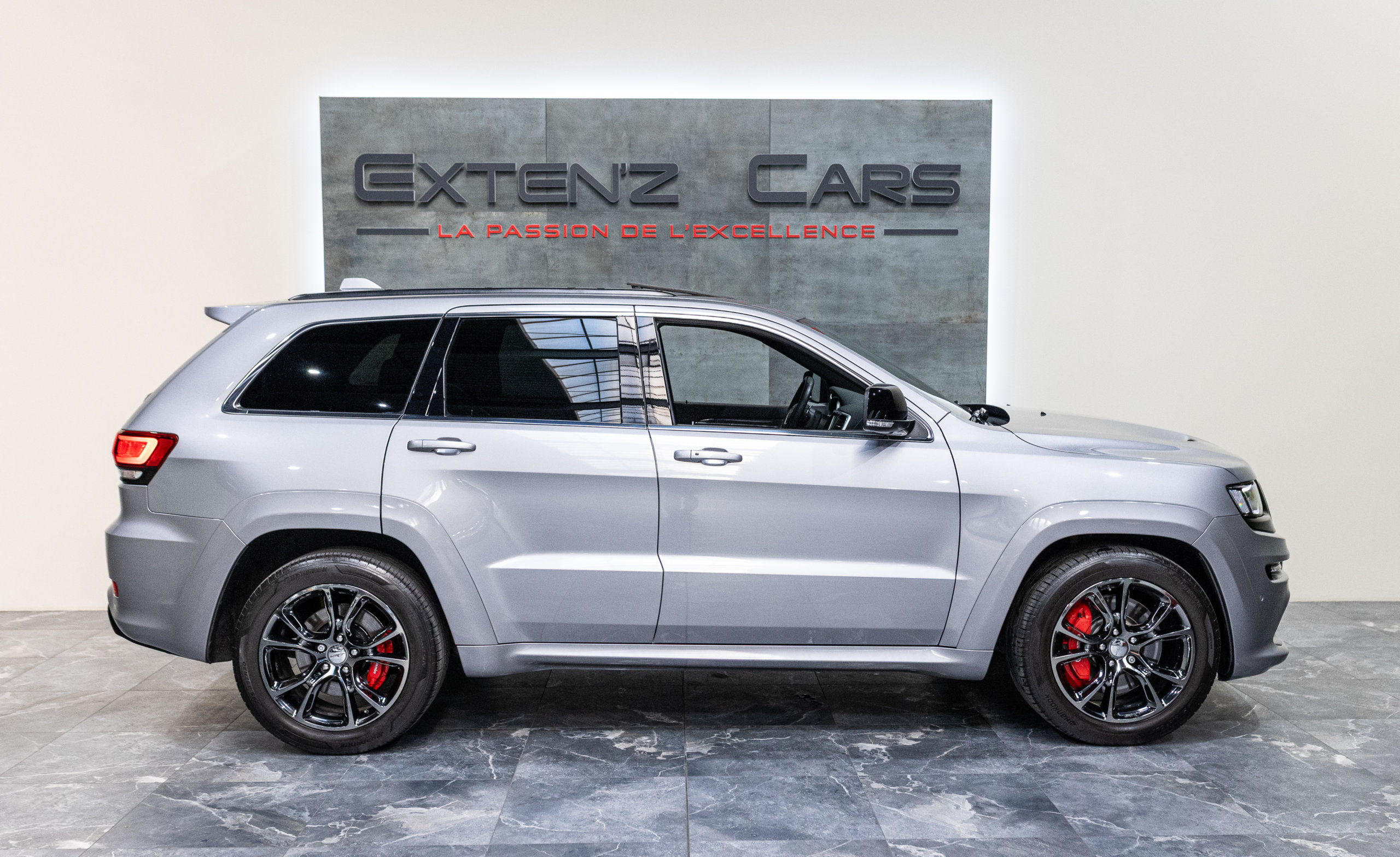 EXTEN’Z CARS vous propose ce magnifique et rare Jeep Grand Cherokee 6.4 HEMI SRT-8, Trois lettres mythiques pour Street & Racing Technology qui annoncent la couleur. Sous le capot abrite un moteur atmosphérique V8 HEMI de 6,4 litres de cylindrée : un gros bloc huit cylindres atmosphérique, délivrant une puissance de 468 CV (38cv), mise en circulation le 10/11/2015 de couleur Billet Silver Métallisée. Mécanique développée pour offrir de hautes performances, d’ailleurs pour parler de performances, le SRT dispose d’un système Launch Control comme on peut trouver dans les meilleures sportives du marché. Les accélérations à plein régime sont toujours accompagnées d’un rugissement du V8 qui donne des frissons. La mécanique est couplée à une boîte automatique ZF 8 rapports, probablement l’une des meilleures transmissions automatiques du marché. Le passage des vitesses est ultra rapide aussi bien en mode normal qu’en mode sport. C’est un régal et si nécessaire, vous pouvez également prendre le contrôle au moyen des palettes situées derrière le volant. Ses jantes de 20 pouces, qui laissent entrevoir les freins Brembo peints en rouge sur lesquels sont montés des pneus ultralarges. Ce Grand Cherokee dispose d’un système Selec-Trac qui régule le contrôle de stabilité, la suspension, le blocage du différentiel, la réactivité du moteur et les changements de rapports. Le Grand Cherokee se manie avec aisance et dispose d’un excellent rayon de braquage. Les assistances au parking avant et arrière, plus la caméra de recul, vous permettront de vous aventurer en ville sans aucun souci.