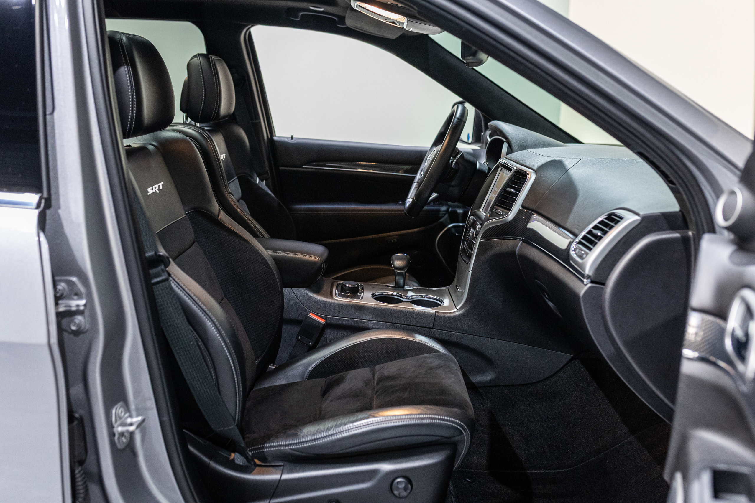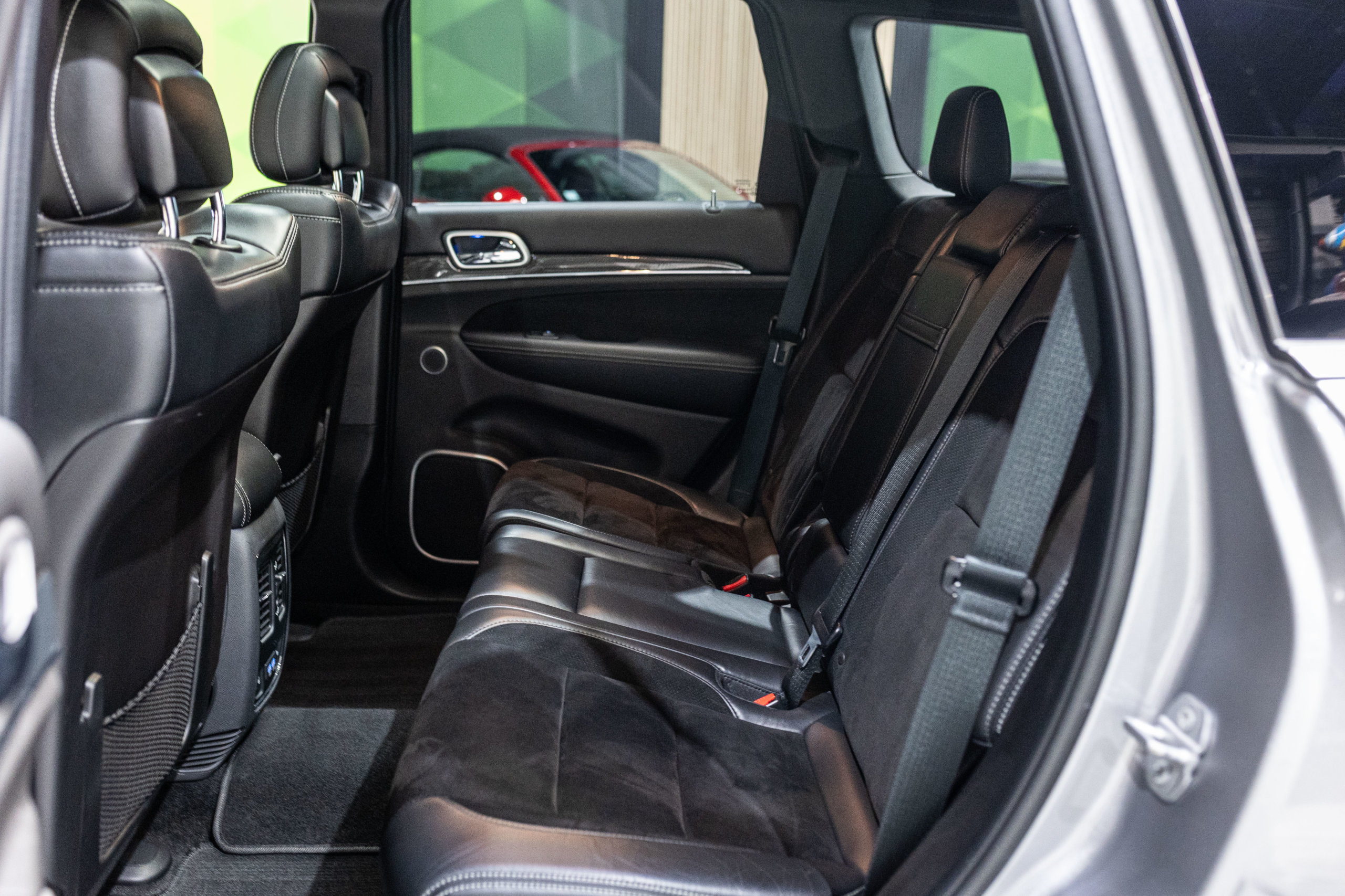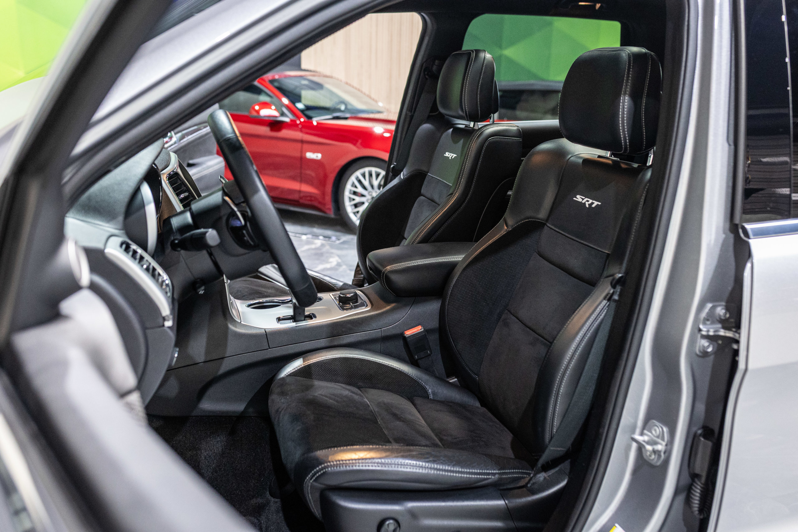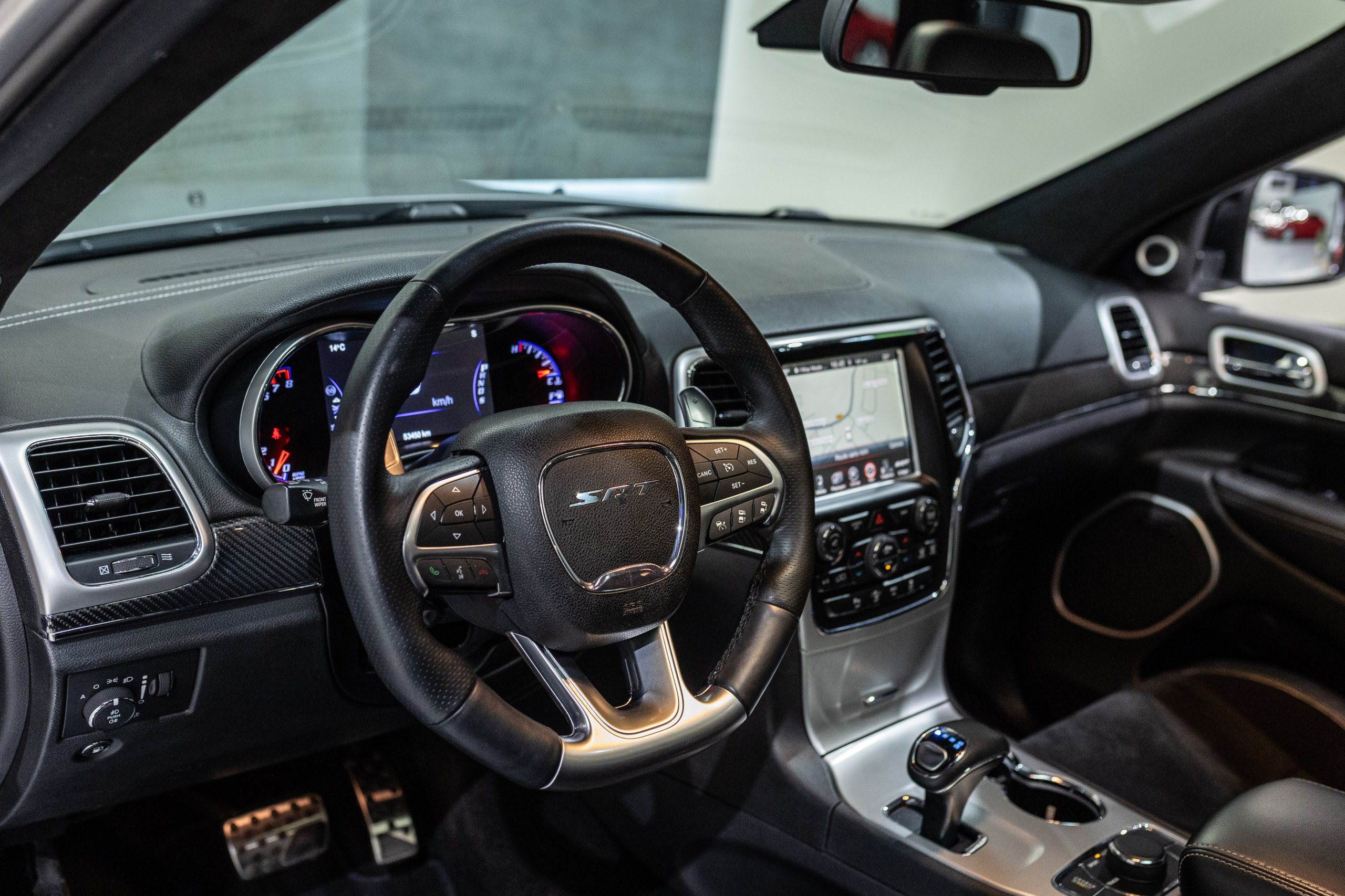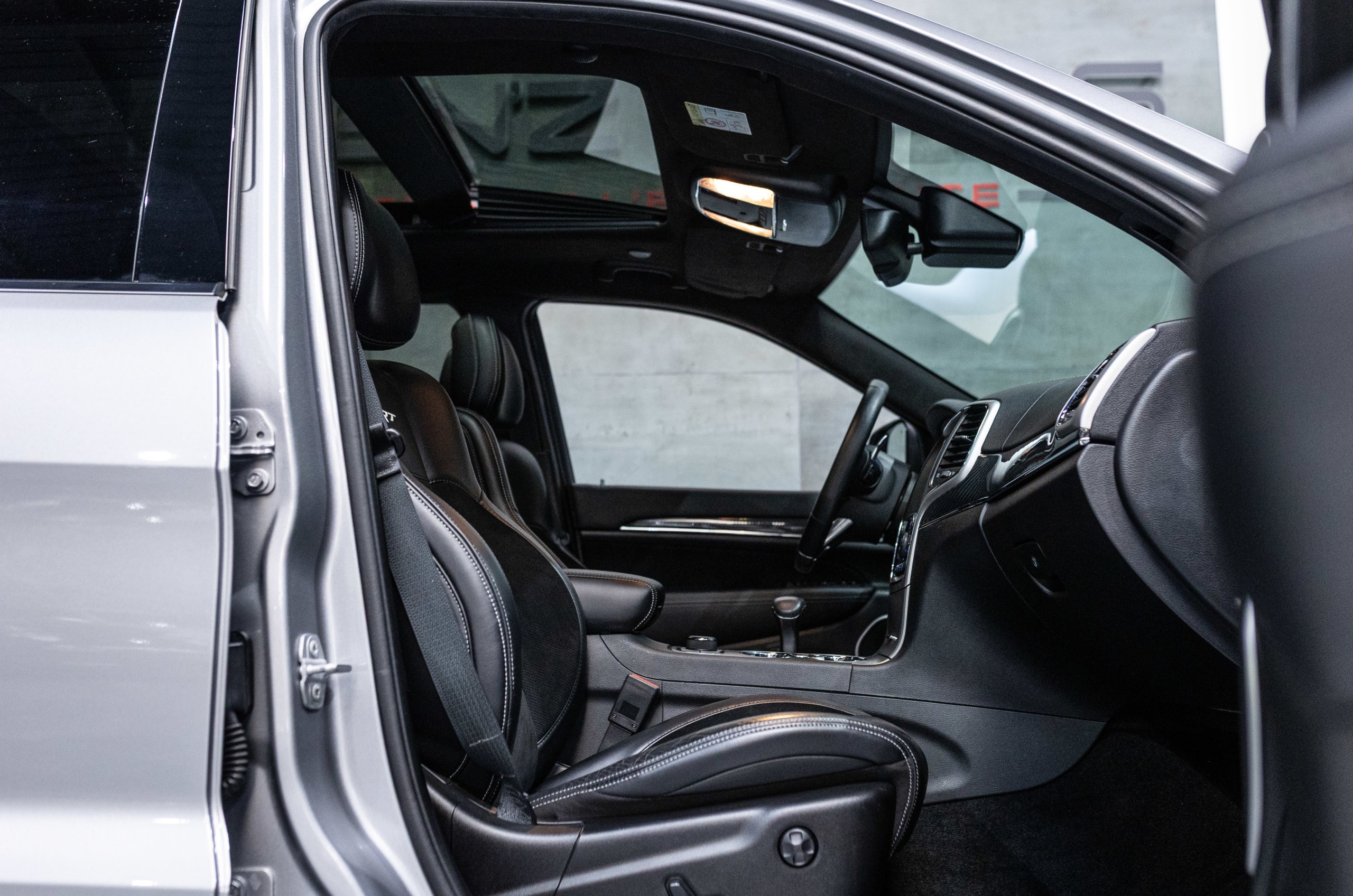 EXTEN’Z CARS vous propose ce magnifique et rare Jeep Grand Cherokee 6.4 HEMI SRT-8, Trois lettres mythiques pour Street & Racing Technology qui annoncent la couleur. Sous le capot abrite un moteur atmosphérique V8 HEMI de 6,4 litres de cylindrée : un gros bloc huit cylindres atmosphérique, délivrant une puissance de 468 CV (38cv), mise en circulation le 10/11/2015 de couleur Billet Silver Métallisée. Mécanique développée pour offrir de hautes performances, d’ailleurs pour parler de performances, le SRT dispose d’un système Launch Control comme on peut trouver dans les meilleures sportives du marché. Les accélérations à plein régime sont toujours accompagnées d’un rugissement du V8 qui donne des frissons. La mécanique est couplée à une boîte automatique ZF 8 rapports, probablement l’une des meilleures transmissions automatiques du marché. Le passage des vitesses est ultra rapide aussi bien en mode normal qu’en mode sport. C’est un régal et si nécessaire, vous pouvez également prendre le contrôle au moyen des palettes situées derrière le volant. Ses jantes de 20 pouces, qui laissent entrevoir les freins Brembo peints en rouge sur lesquels sont montés des pneus ultralarges. Ce Grand Cherokee dispose d’un système Selec-Trac qui régule le contrôle de stabilité, la suspension, le blocage du différentiel, la réactivité du moteur et les changements de rapports. Le Grand Cherokee se manie avec aisance et dispose d’un excellent rayon de braquage. Les assistances au parking avant et arrière, plus la caméra de recul, vous permettront de vous aventurer en ville sans aucun souci.