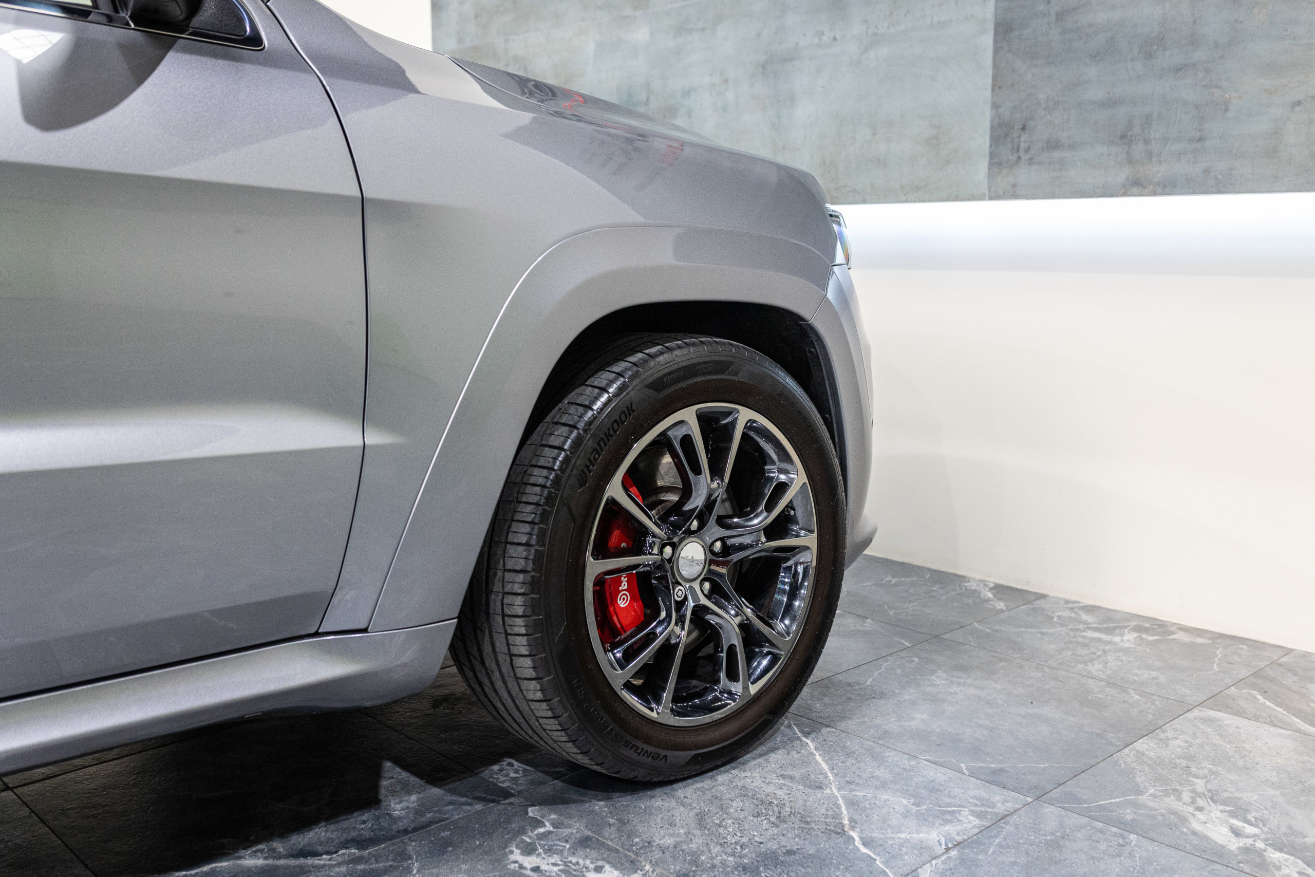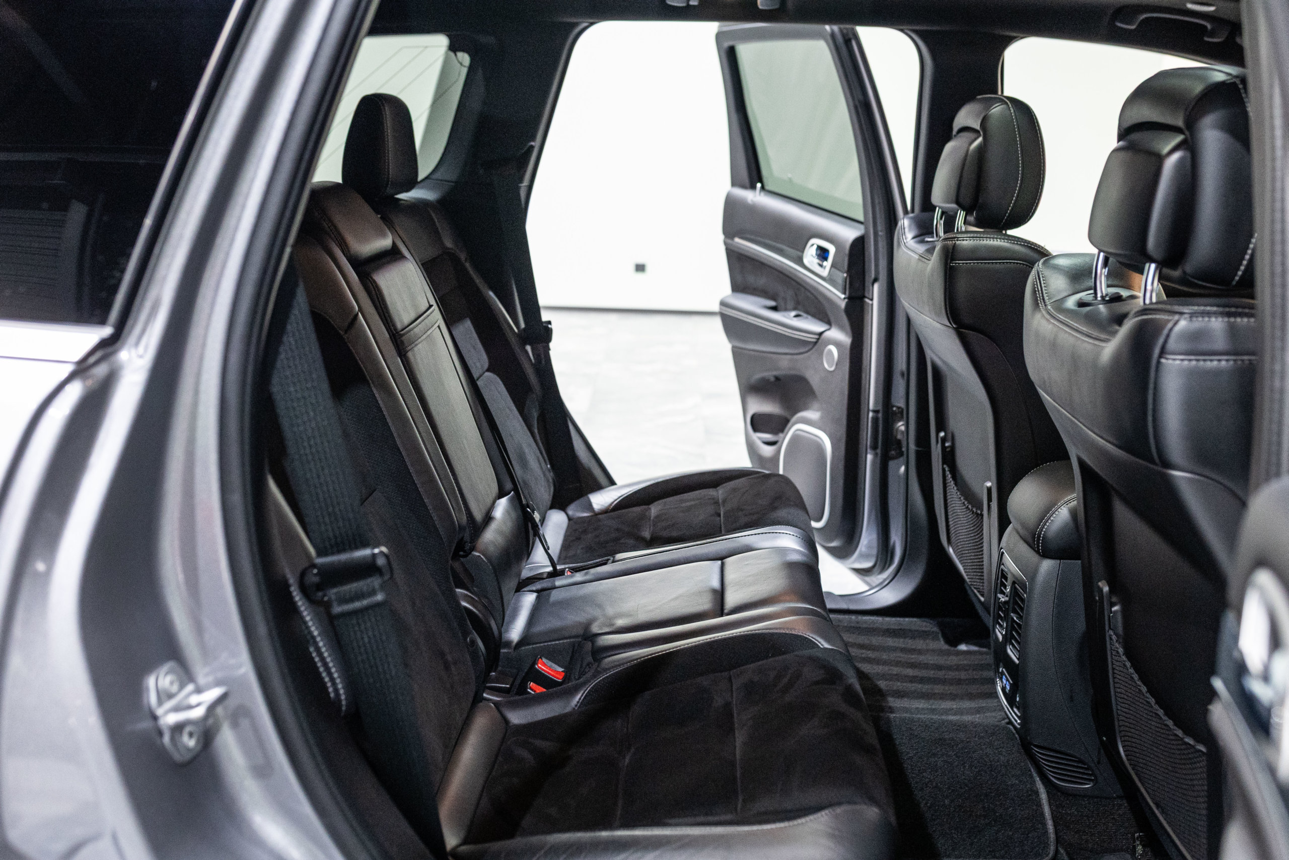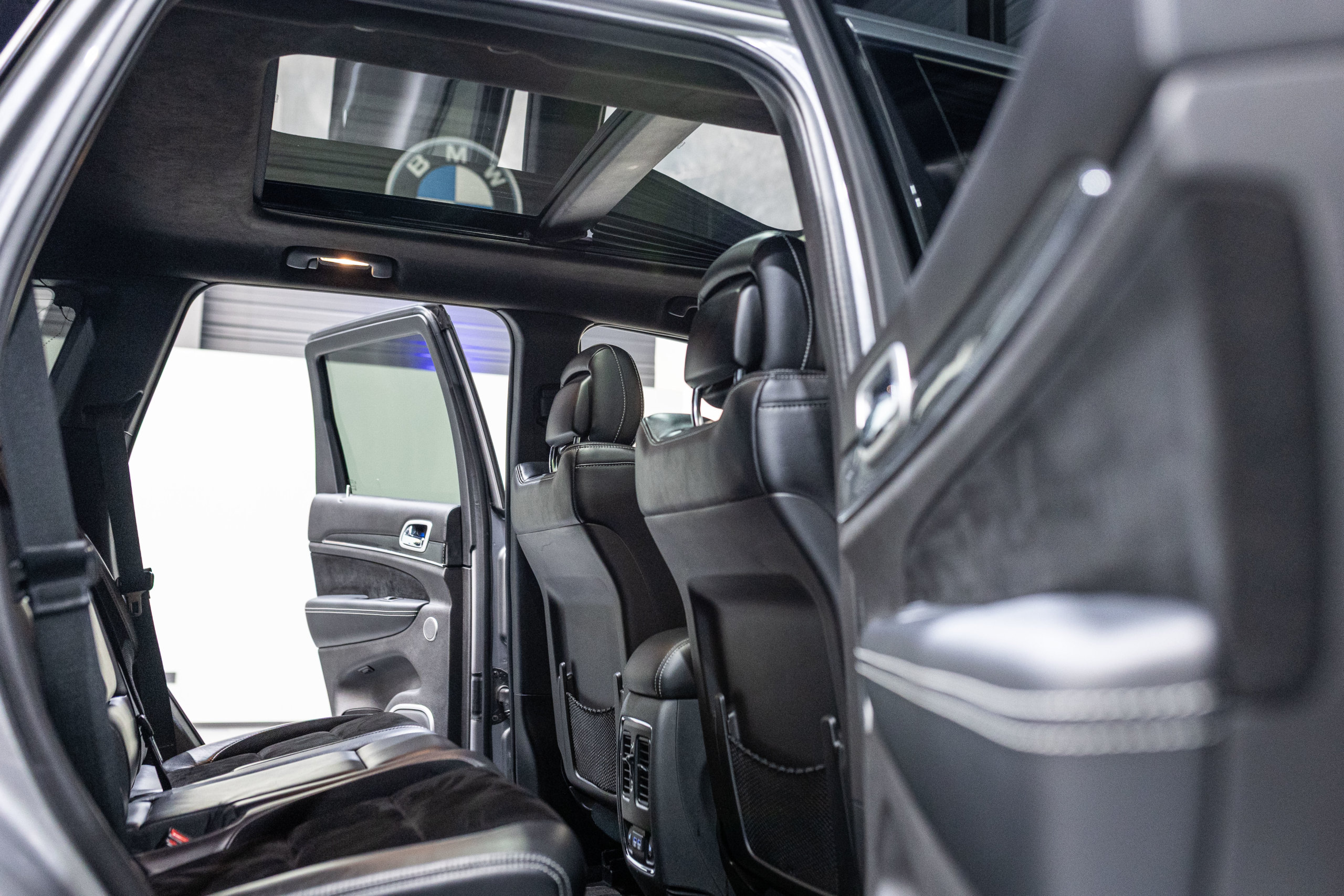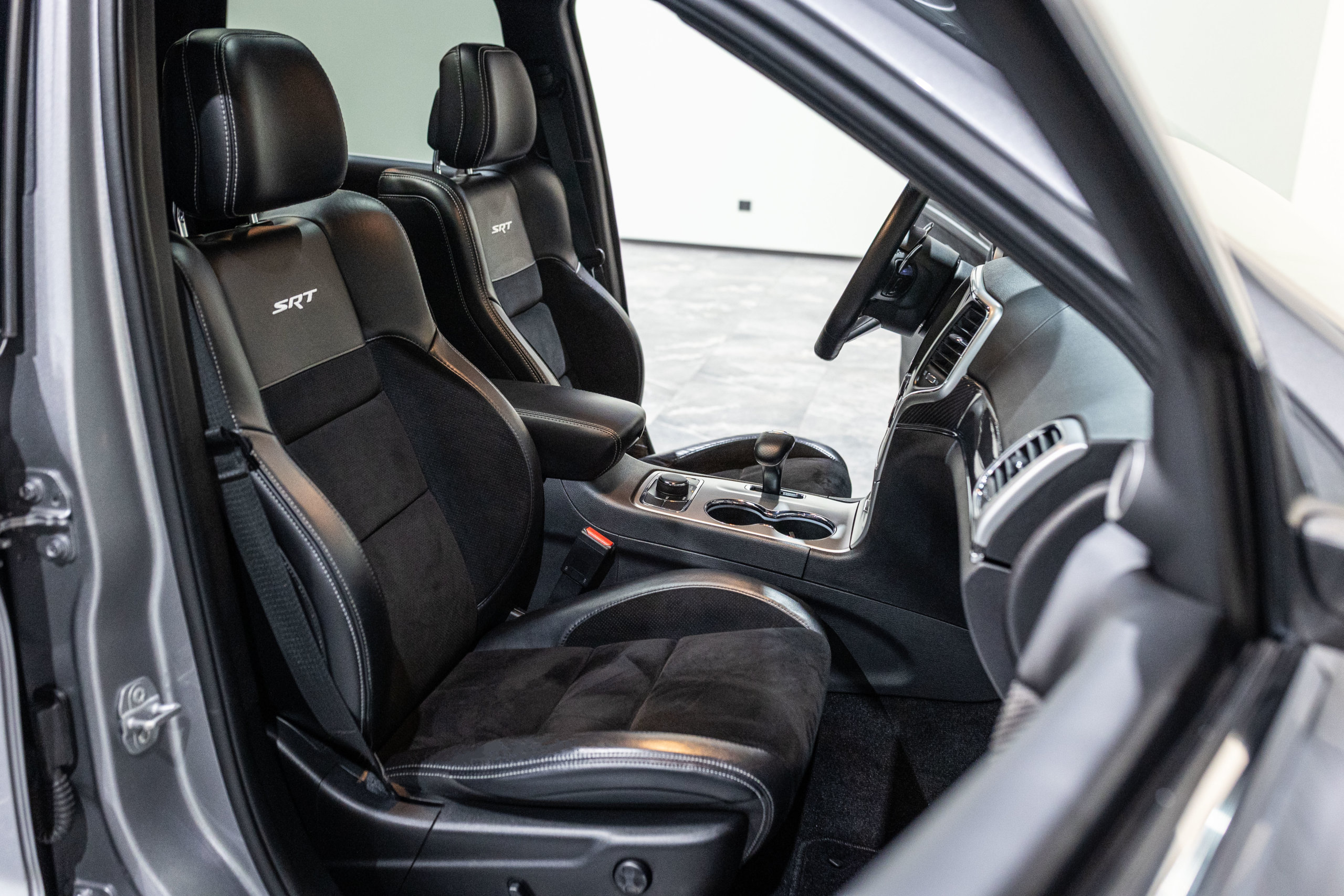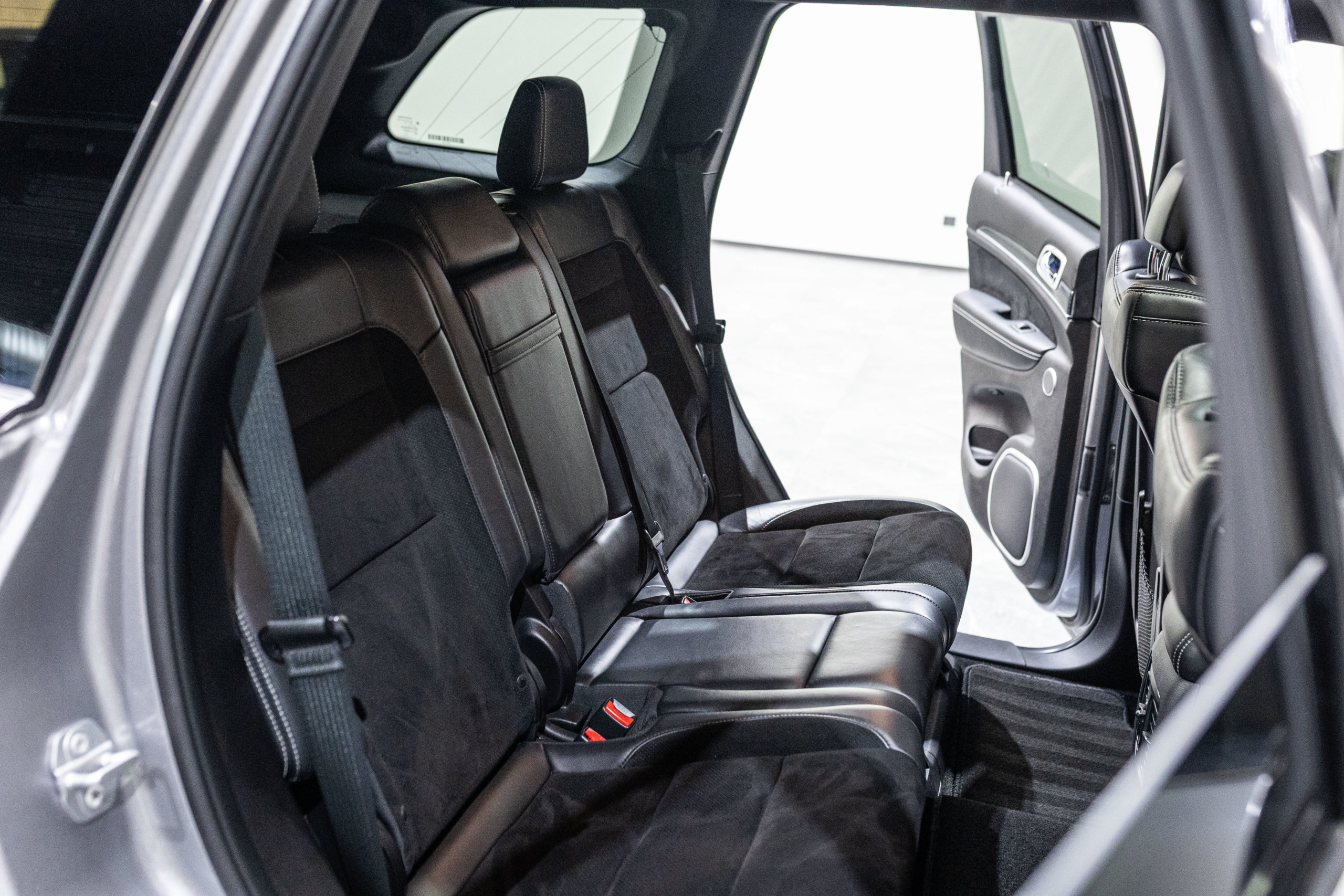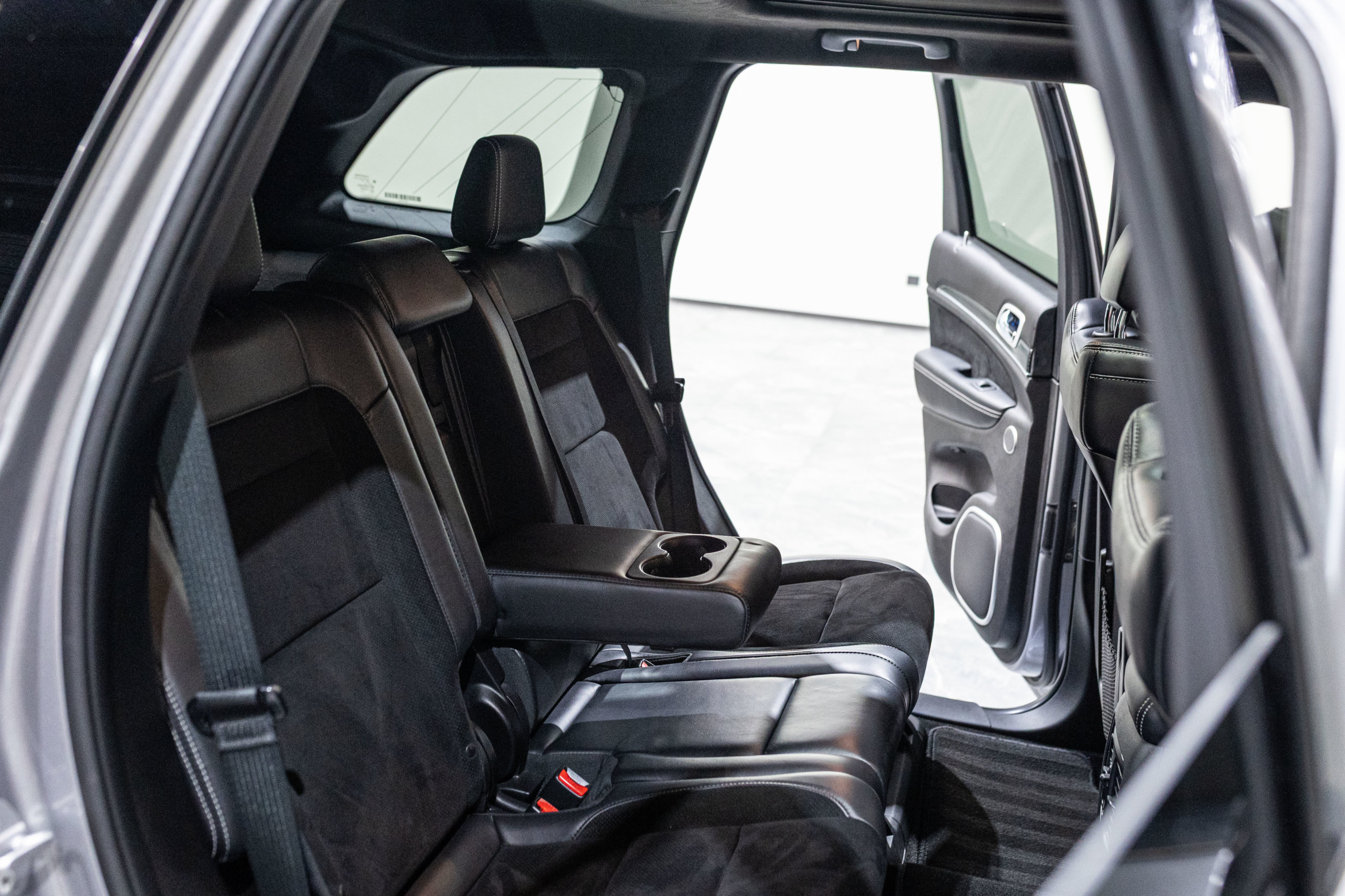 EXTEN’Z CARS vous propose ce magnifique et rare Jeep Grand Cherokee 6.4 HEMI SRT-8, Trois lettres mythiques pour Street & Racing Technology qui annoncent la couleur. Sous le capot abrite un moteur atmosphérique V8 HEMI de 6,4 litres de cylindrée : un gros bloc huit cylindres atmosphérique, délivrant une puissance de 468 CV (38cv), mise en circulation le 10/11/2015 de couleur Billet Silver Métallisée. Mécanique développée pour offrir de hautes performances, d’ailleurs pour parler de performances, le SRT dispose d’un système Launch Control comme on peut trouver dans les meilleures sportives du marché. Les accélérations à plein régime sont toujours accompagnées d’un rugissement du V8 qui donne des frissons. La mécanique est couplée à une boîte automatique ZF 8 rapports, probablement l’une des meilleures transmissions automatiques du marché. Le passage des vitesses est ultra rapide aussi bien en mode normal qu’en mode sport. C’est un régal et si nécessaire, vous pouvez également prendre le contrôle au moyen des palettes situées derrière le volant. Ses jantes de 20 pouces, qui laissent entrevoir les freins Brembo peints en rouge sur lesquels sont montés des pneus ultralarges. Ce Grand Cherokee dispose d’un système Selec-Trac qui régule le contrôle de stabilité, la suspension, le blocage du différentiel, la réactivité du moteur et les changements de rapports. Le Grand Cherokee se manie avec aisance et dispose d’un excellent rayon de braquage. Les assistances au parking avant et arrière, plus la caméra de recul, vous permettront de vous aventurer en ville sans aucun souci.