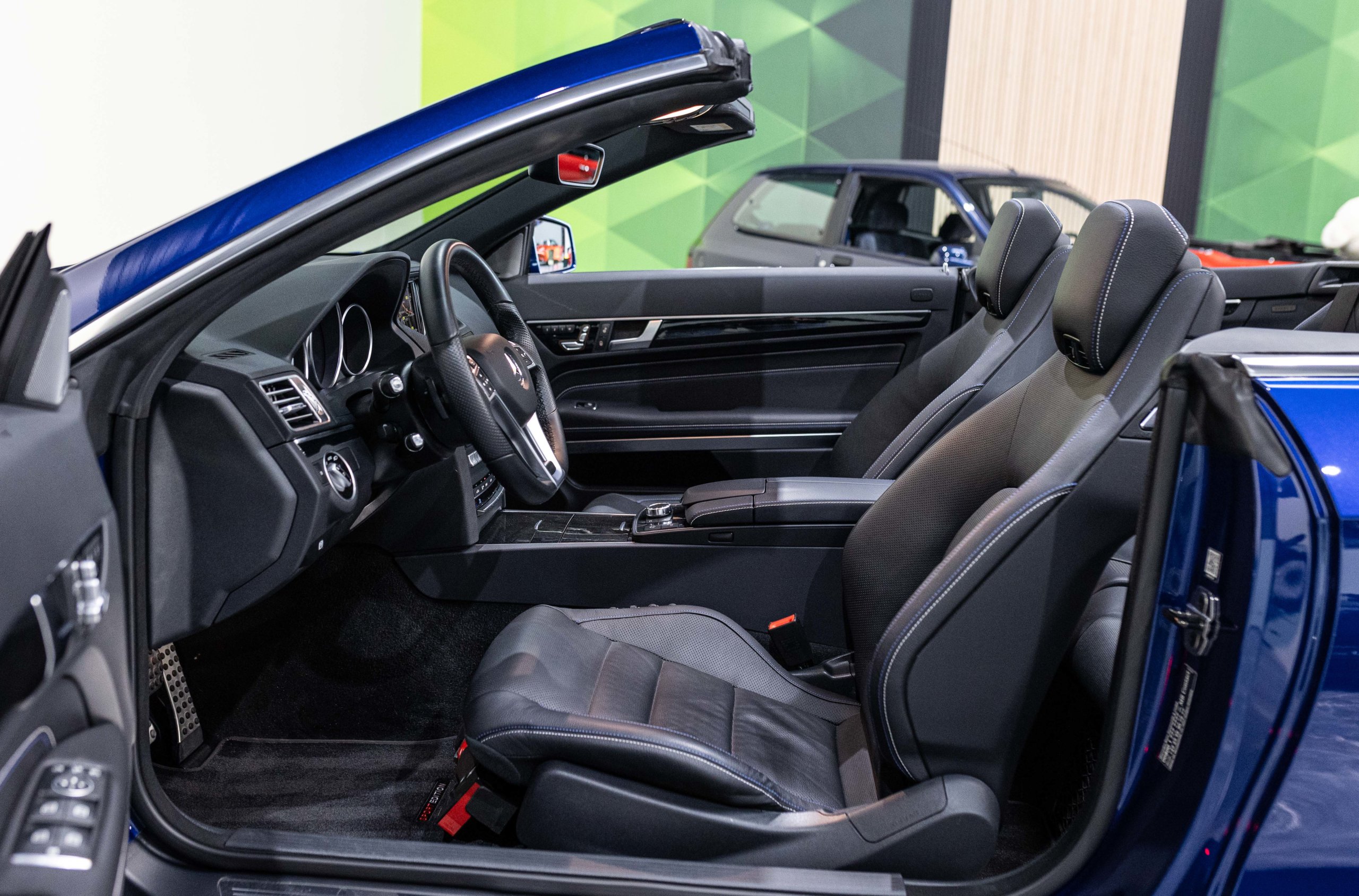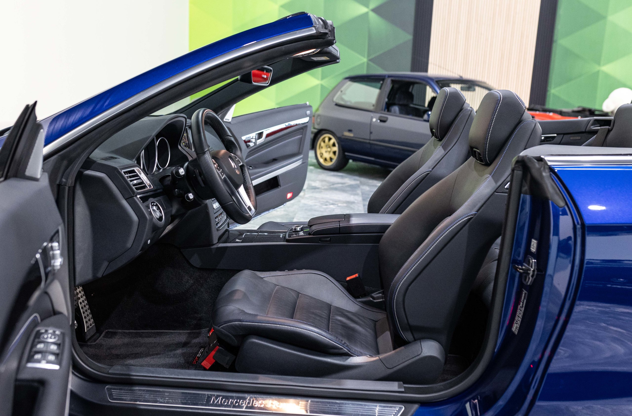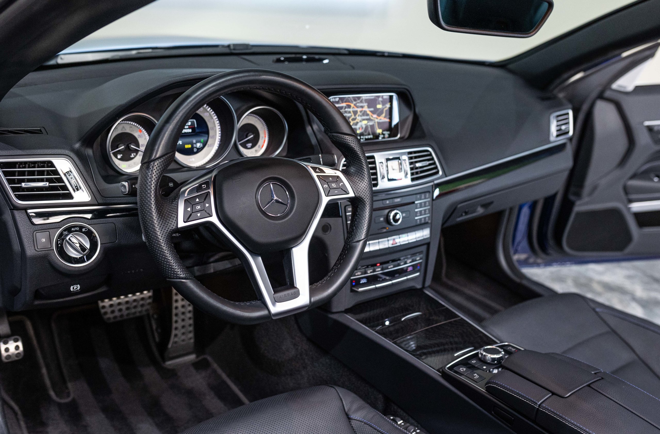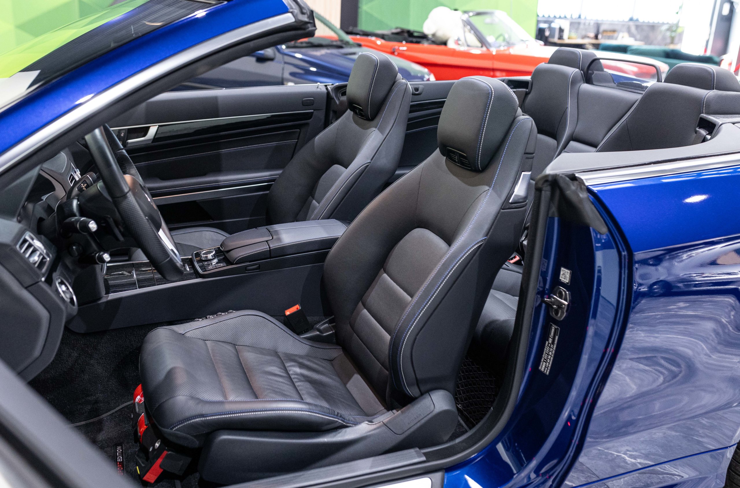 EXTEN’Z CARS vous propose cette magnifique et luxueuse MERCEDES Classe E 400 Cabriolet Fascination AMG avec son V6 3.5 délivrant 333 CV (22cv), mise en circulation le 07/02/2017 de Couleur Bleu Brillant MANUFAKTUR. La Mercedes Classe E Cabriolet est une franche réussite esthétique. S’appuyant sur les principales lignes de sa grande sœur, la Classe S. Cette auto est avant tout confortable. Les moindres aspérités sont gommées, et que dire de l’insonorisation à bord… ça frôle le sans-faute. Associée à une boite à vitesse automatique à sept rapports, si vous préférez une conduite plus sportive, il lui suffit de passer en mode manuel à l’aide des palettes de changement de vitesse au volant pour disposer alors des sept rapports fixes. La Mercedes Classe E Cabriolet sait nous accueillir, et que dire de la petite horloge à aiguilles qui trône au centre de la console centrale. En termes de finition il n’y a rien à redire, le choix des matériaux est pertinent.